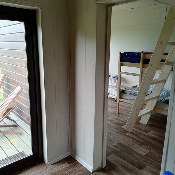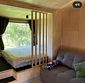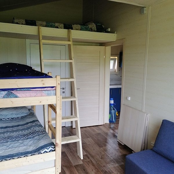Комфортабельный уютный домик с террасой. Внутри двуспальный диван, двухъярусная кровать и романтическое двуспальное место на мансарде. Внутри дома есть санузел с биотуалетом и рукомойником. Также, прямо в доме, находится полноценная кухня с газовой плитой, набором посуды и емкостью с питьевой водой, очищенной шунгитом.