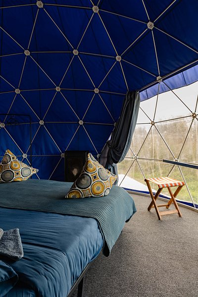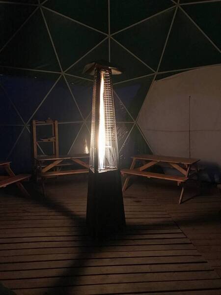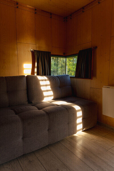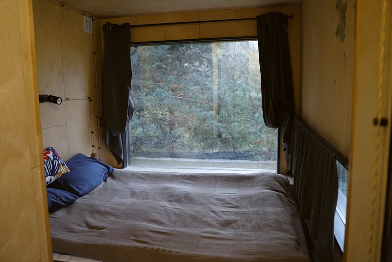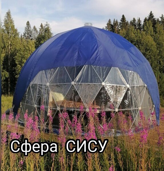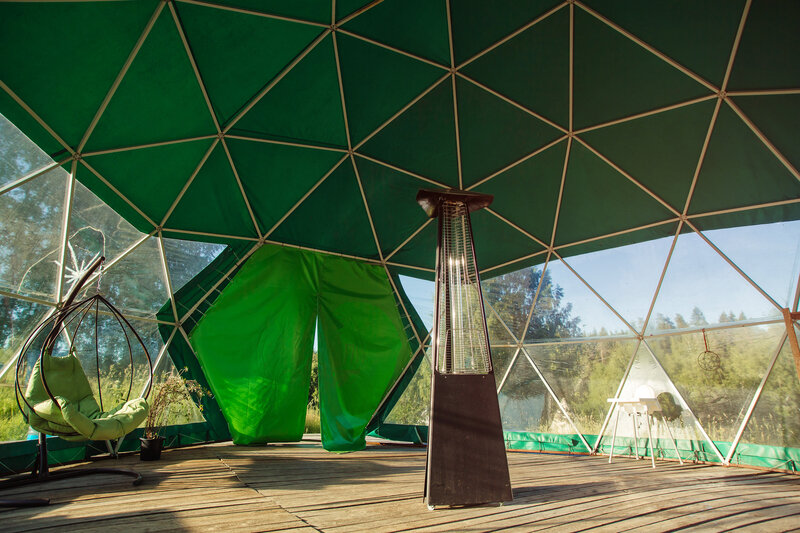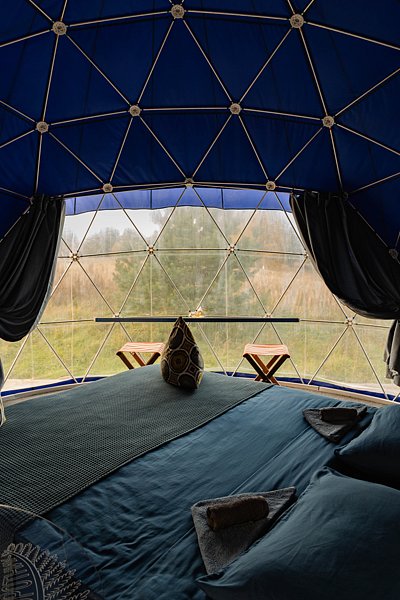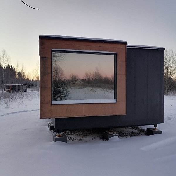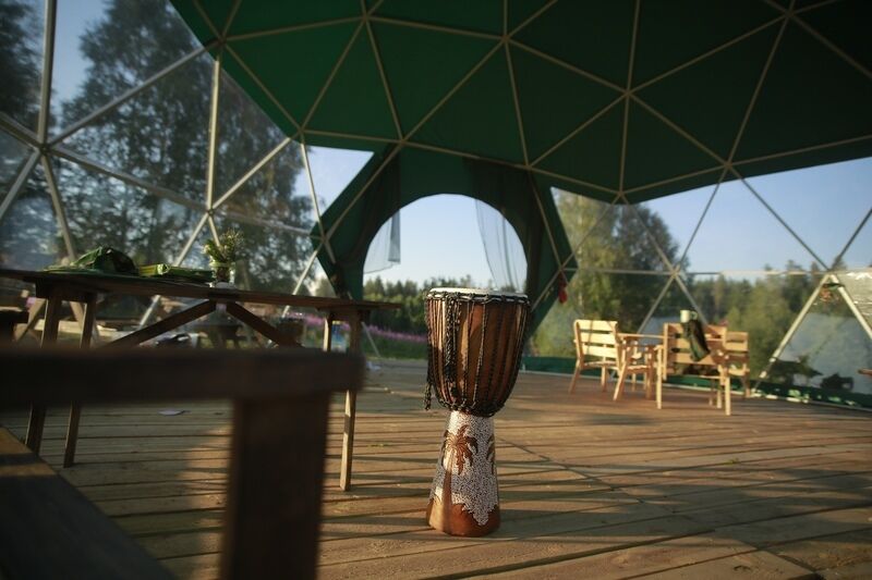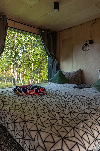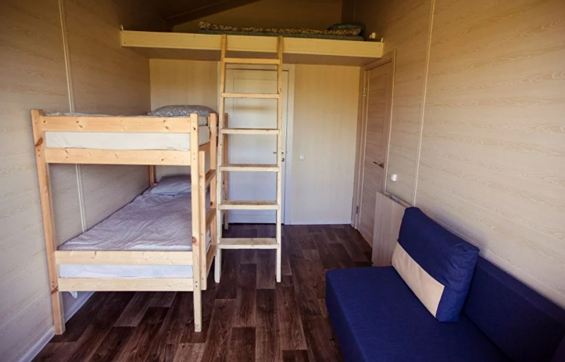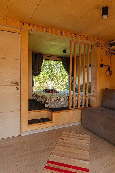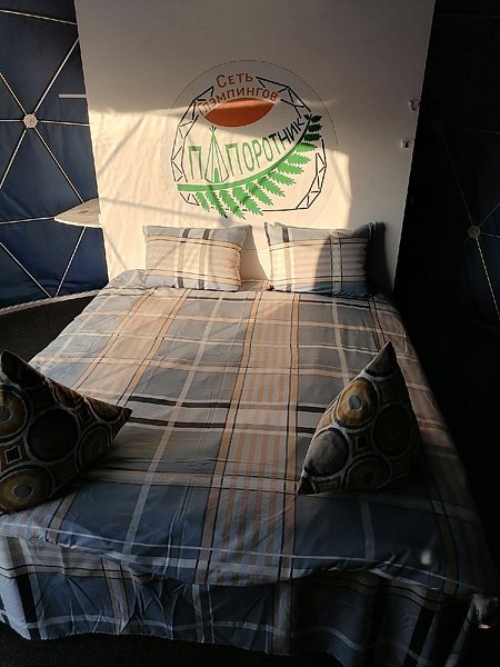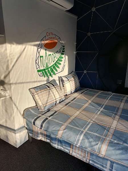 Комфортабельный уютный модуль с необычным интерьером и панорамным окном. Внутри двуспальная кровать, возможно доп. место на раскладушке. Внутри дома есть санузел с биотуалетом и рукомойником. Рядом с каждым жилым модулем свой бесплатный мангал.