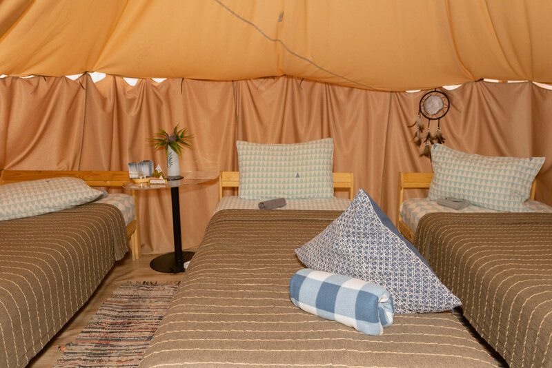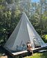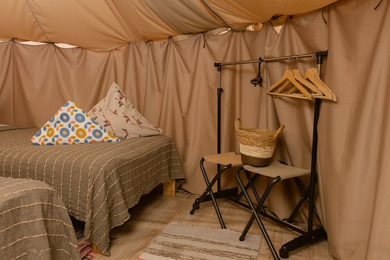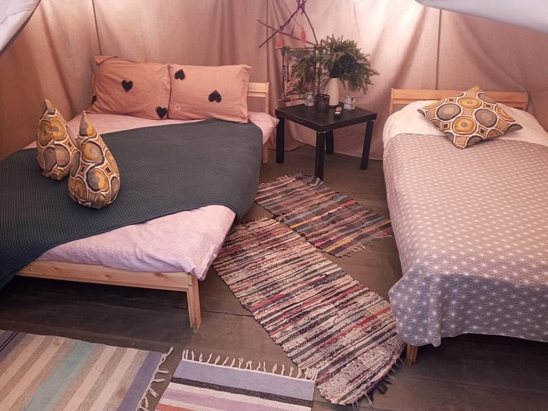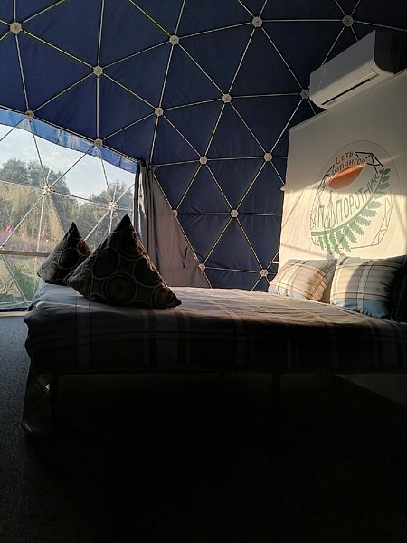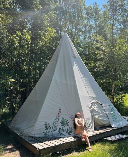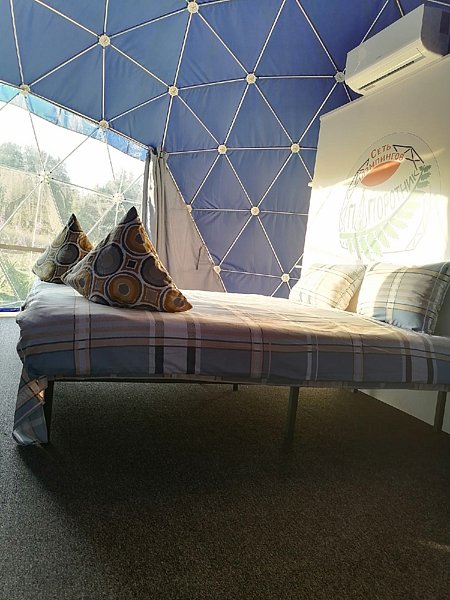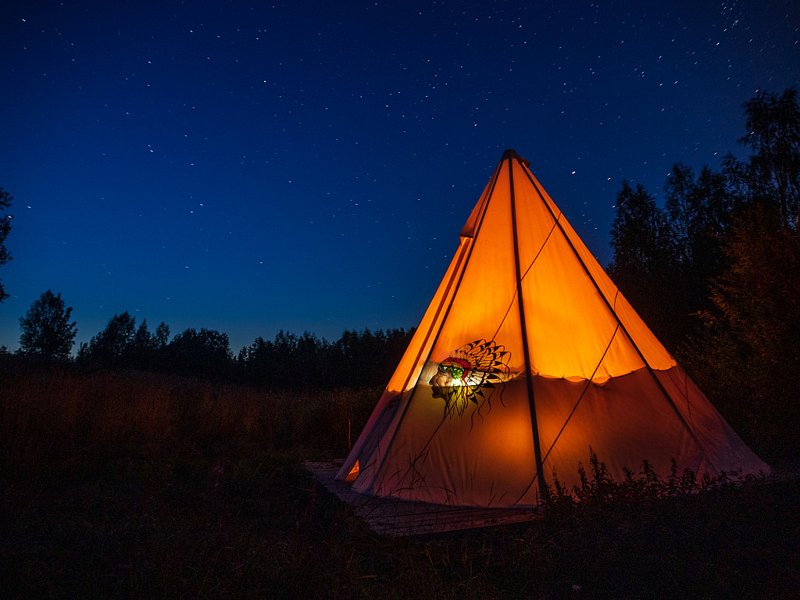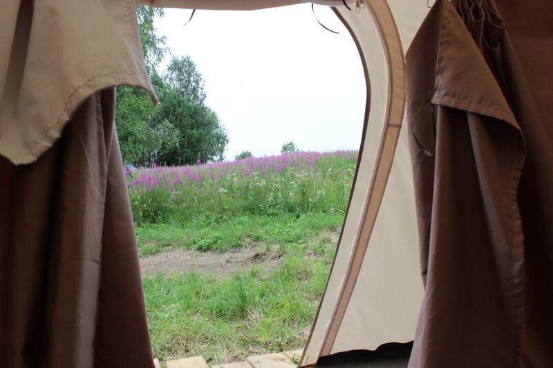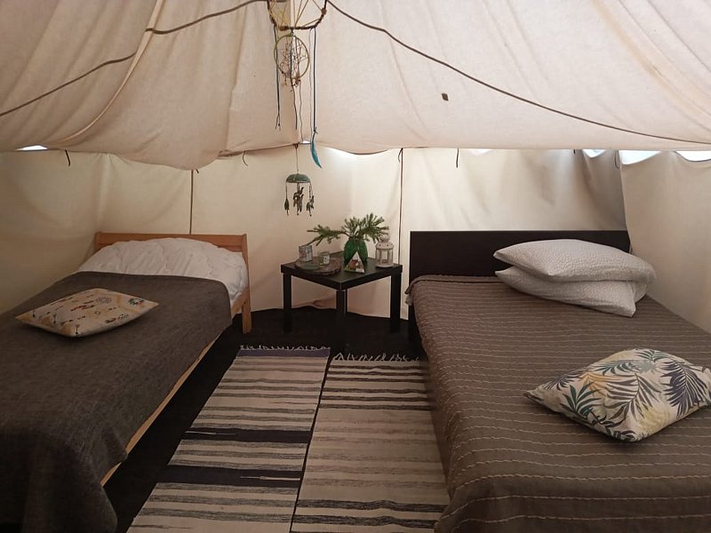 Комфортабельный уютный шатер с террасой. Внутри двуспальная кровать и односпальные кровати. В каждом шатре рукомойник, электрочайник, микроволновка и емкость с питьевой водой, очищенной шунгитом. Максимальная вместимость 3 человека.