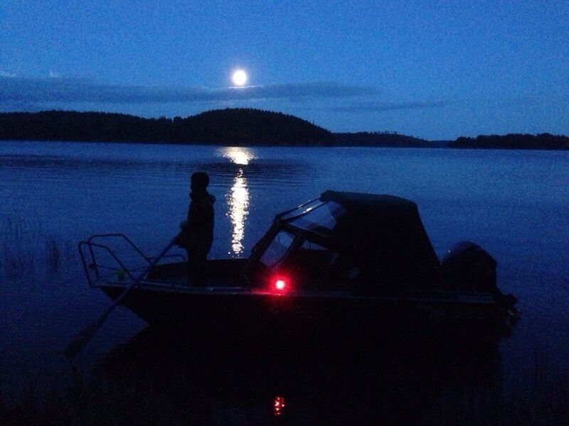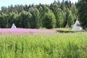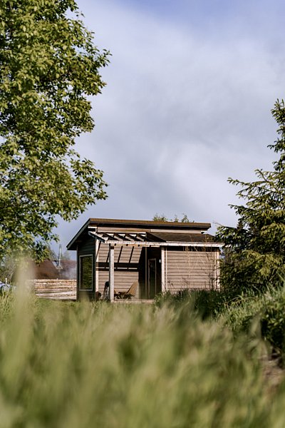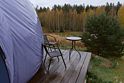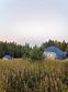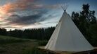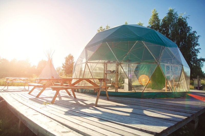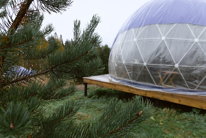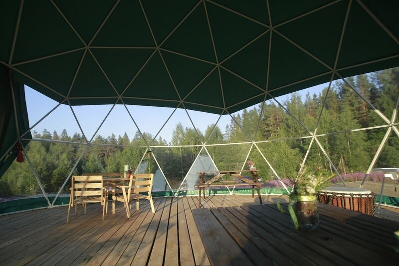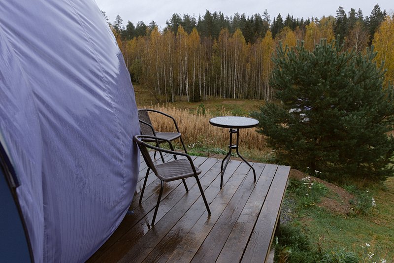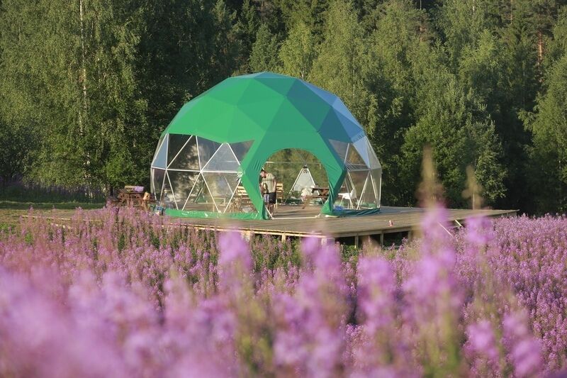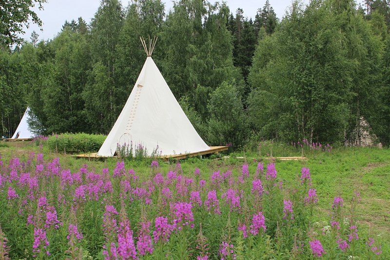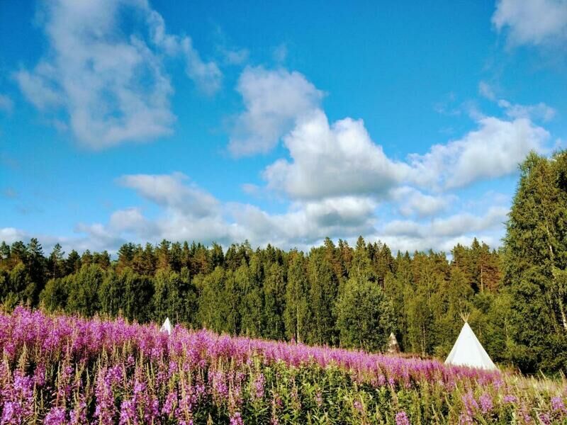 На территории глэмпинга есть настоящая Карельская баня. С ее фасада открывается прекрасный вид на холмы, шатры и закат.