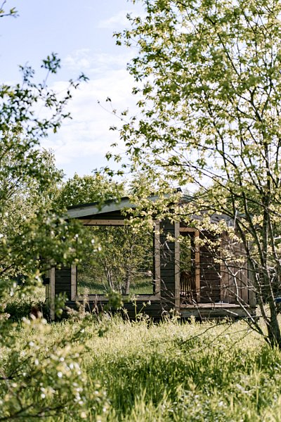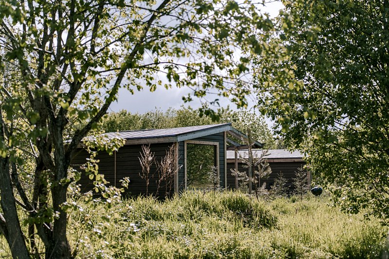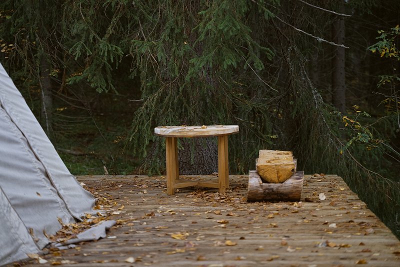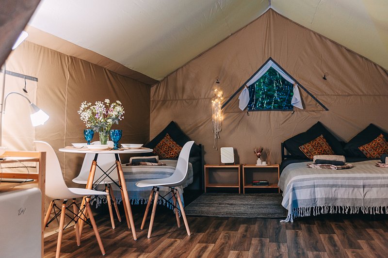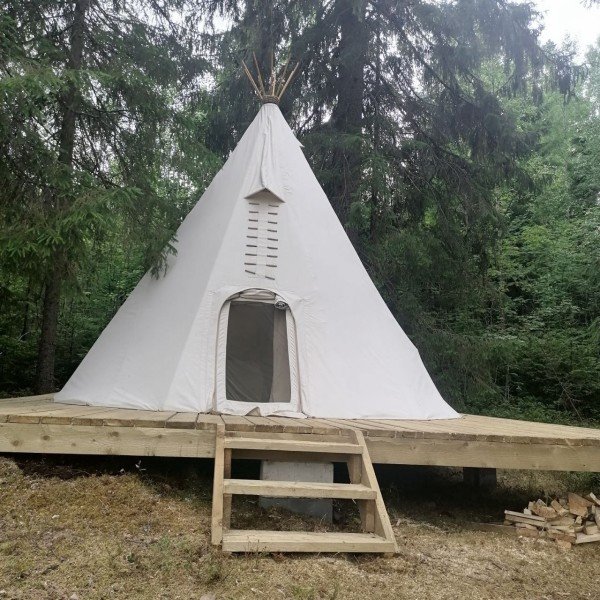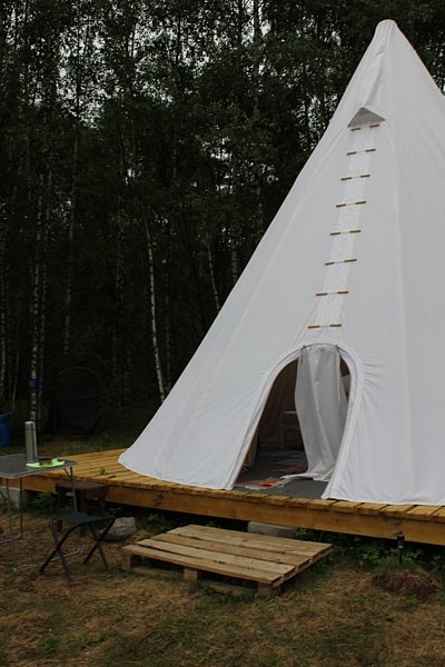Отдыхающие могут разместить в палатках «типи» или выбрать домик-бунгало. Везде удобные мягкие кровати, дизайнерский интерьер, соответствующий популярному скандинавскому «хюгге», и газовый конвектор для отопления. В домиках есть собственный санузел с рукомойником и биотуалетом и крытая терраса. Освещение в «типи» и бунгало на аккумуляторах, розеток нет.