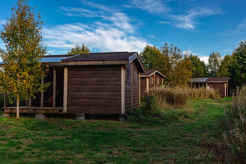 Комфортабельный уютный домик с крытой террасой. Внутри двуспальная кровать, а также раскладывающийся диван. Также есть санузел с биотуалетом и рукомойником. Максимальная вместимость 4 человека.