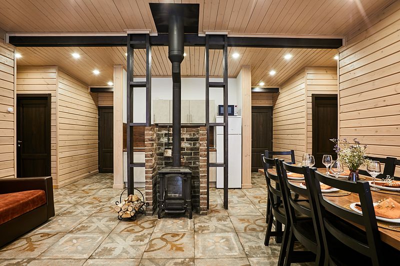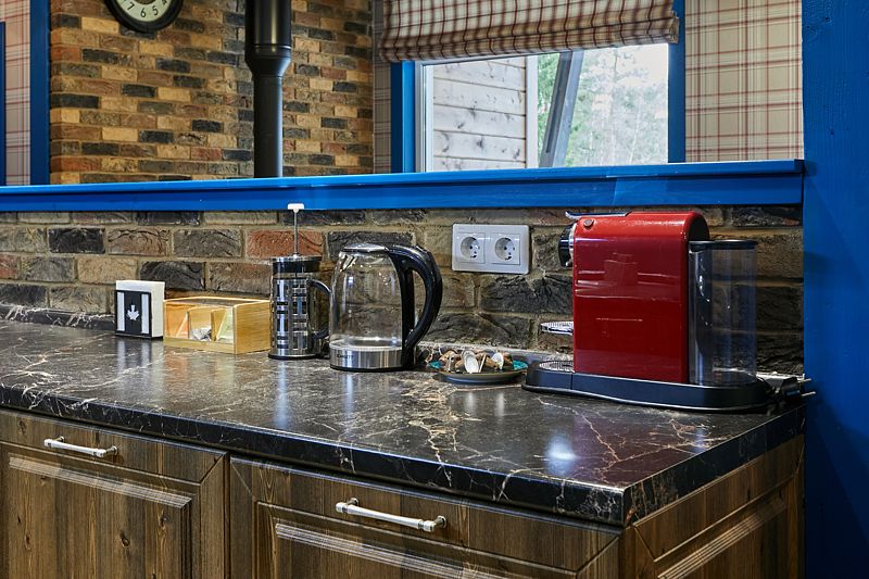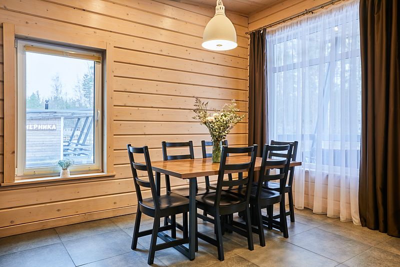 Кухня оборудована всем необходимым для приготовления еды. Есть посуда, бокалы для различных напитков, холодильник, плита, микроволновая печь, электрический чайник, также имеется посудомоечная машина. За большим обеденным столом в гостиной может комфортно разместиться 6 человек, а камин не только поможет согреться в зимние вечера, но и создаст неповторимый уют. В гостиной поможет скрасить досуг телевизор с большой диагональю и функцией Смарт ТВ. На террасе можно приятно провести время с чашечкой чая или бокалом вина, расположившись в удобных ратанговых креслах. При желании постирать в вашем распоряжении имеется стиральная машина . В коттедже есть финская сауна. На мангале можно пожарить мясо или рыбу, уголь и розжиг предоставляется по запросу. Прямо в номер можно заказать еду из ресторана "Иван чай". Банные полотенца, тапочки, гели, шампуни и зубные наборы бесплатно в вашем распоряжении.