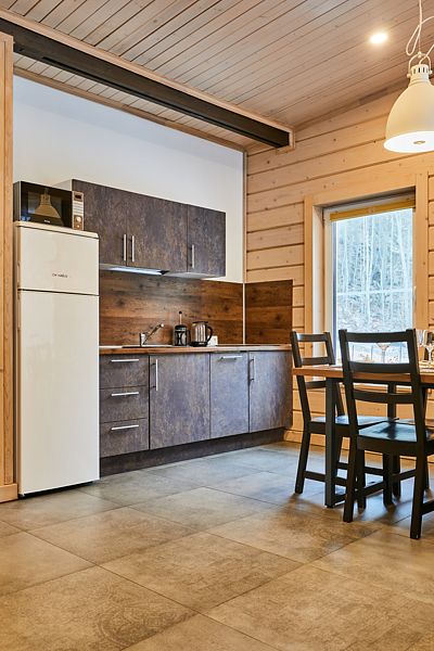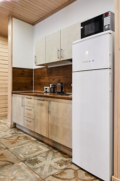 Кухня оборудована всем необходимым для приготовления еды. Есть посуда, бокалы для различных напитков, холодильник, плита, микроволновая печь, электрический чайник, также имеется посудомоечная машина. За большим обеденным столом в гостиной может комфортно разместиться 6 человек, а камин не только поможет согреться в зимние вечера, но и создаст неповторимый уют.