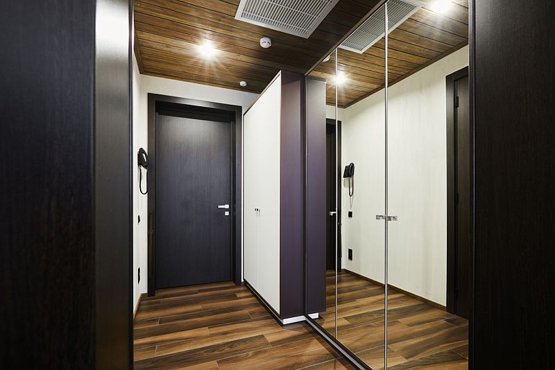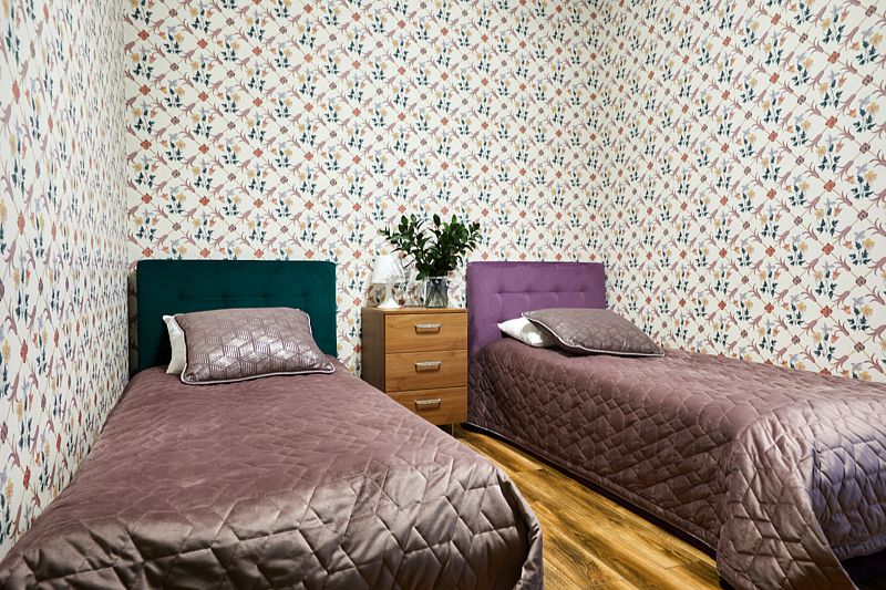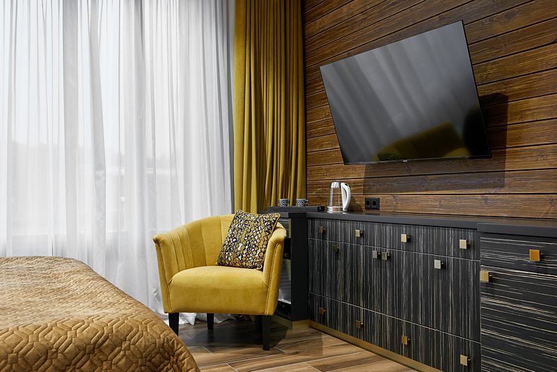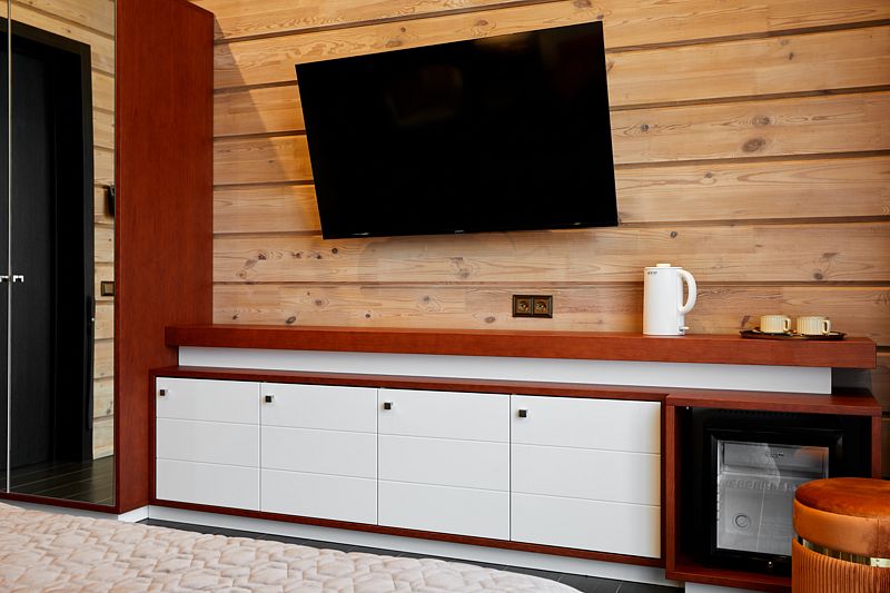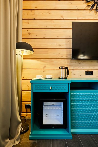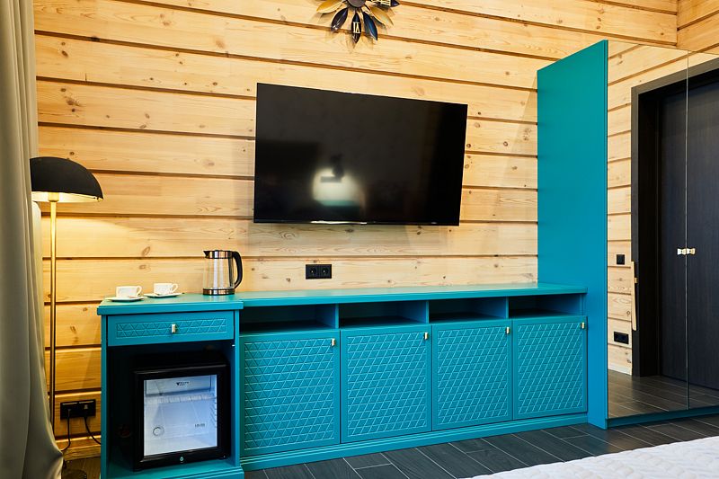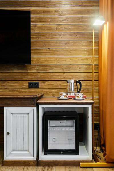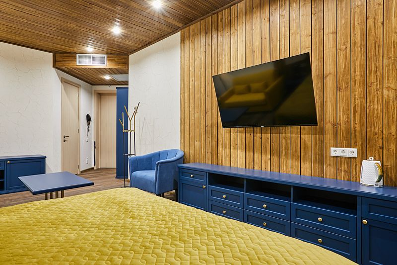 Шторы блэкаут создадут полную темноту даже во время «белых ночей». А огромный телевизор с диагональю 55 дюймов и функцией Смарт ТВ скрасит ваш досуг, если захочется просто поваляться в постели. В номере есть мини холодильник, электрочайник и столовые приборы.