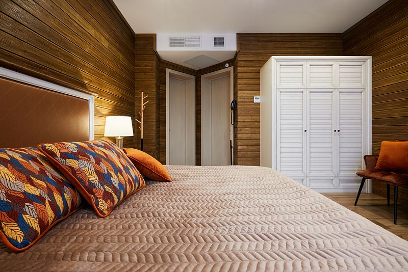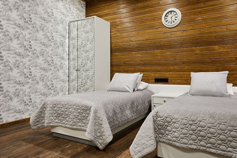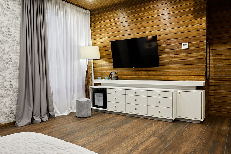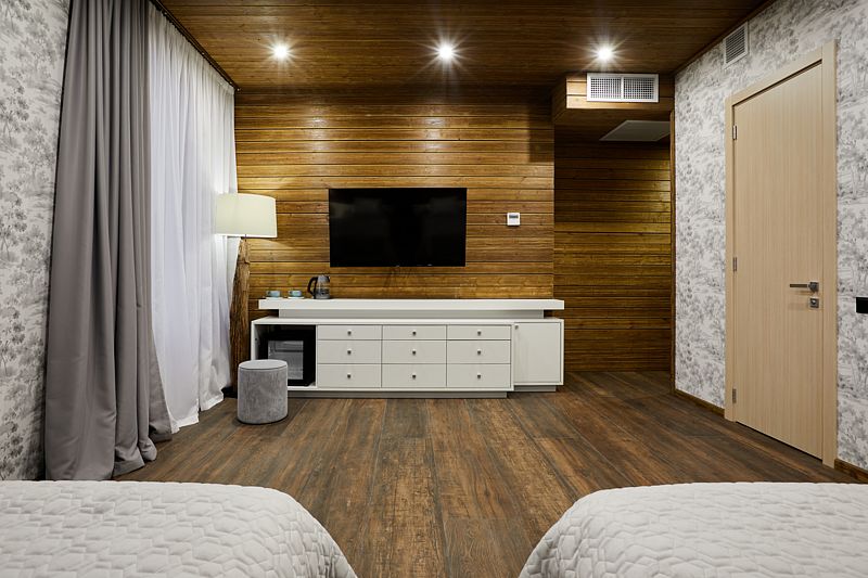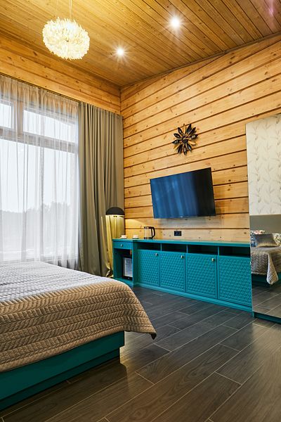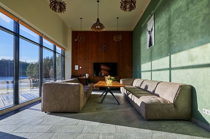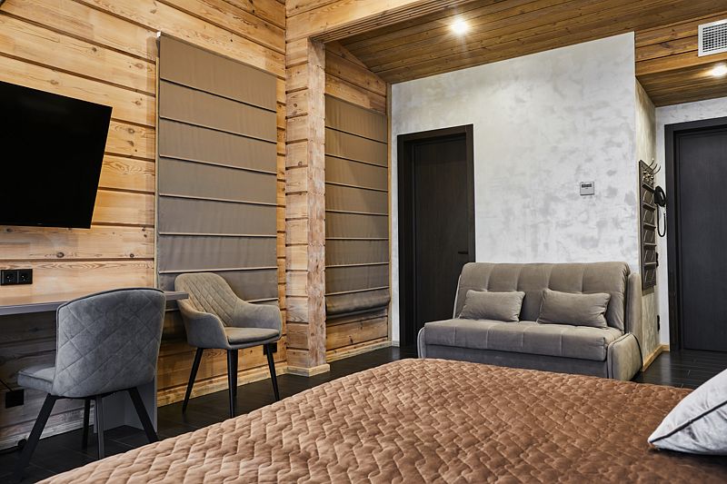 Прекрасный трехместный номер с высококлассным дизайнерским ремонтом и дорогой эксклюзивной мебелью, с двумя односпальными кроватями и раскладным диваном, панорамными окнами и волшебным видом на озеро.