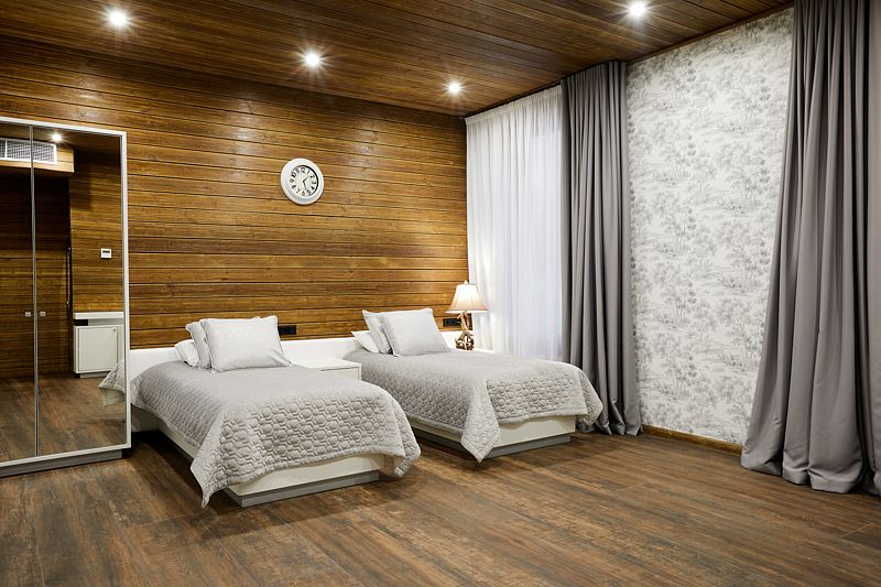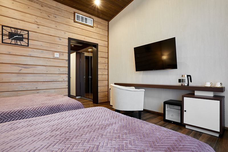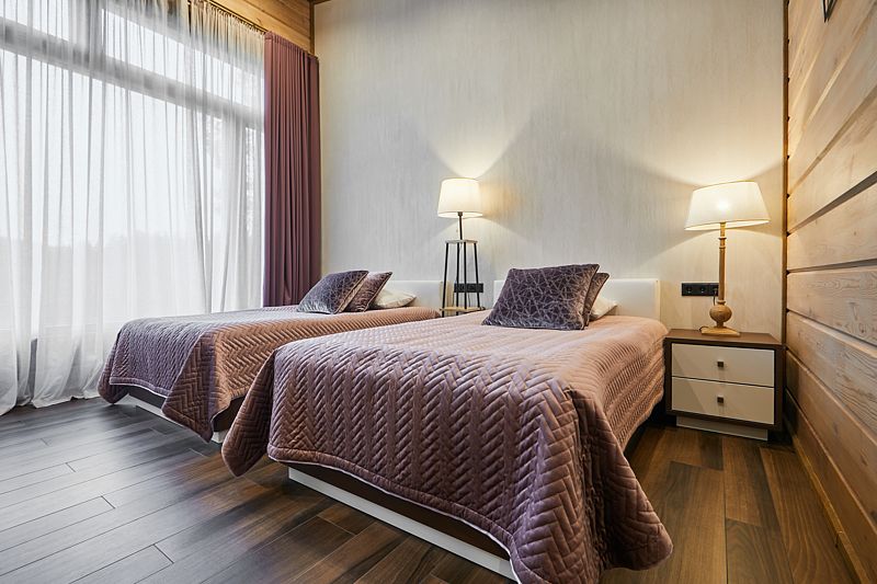 Просторный двухместный номер с высококлассным дизайнерским ремонтом и дорогой эксклюзивной мебелью, с двумя односпальными кроватями, панорамными окнами и волшебным видом на озеро.