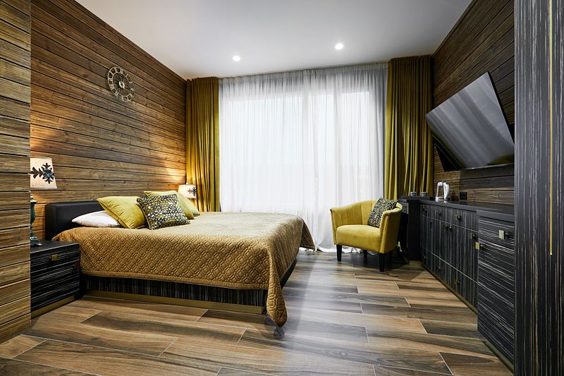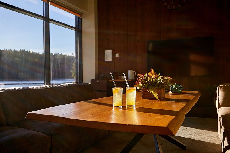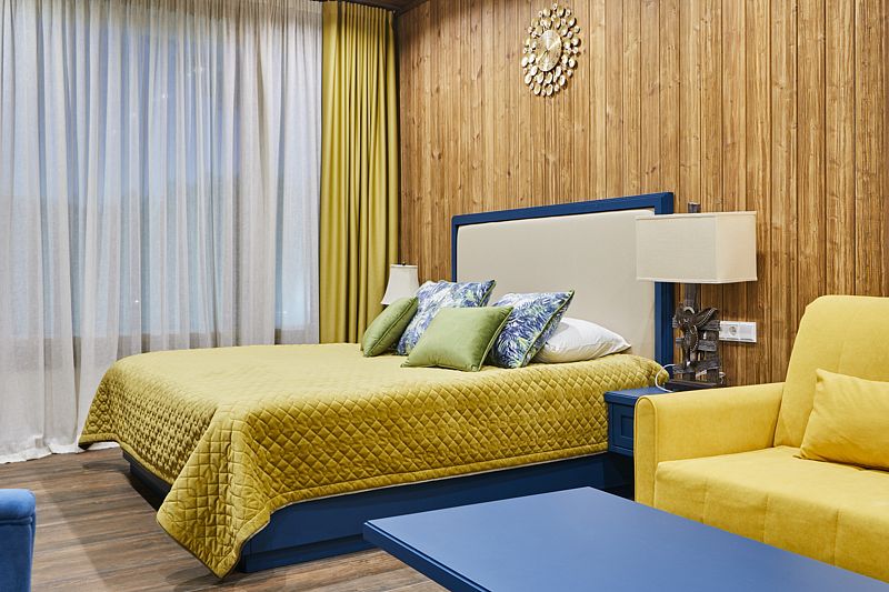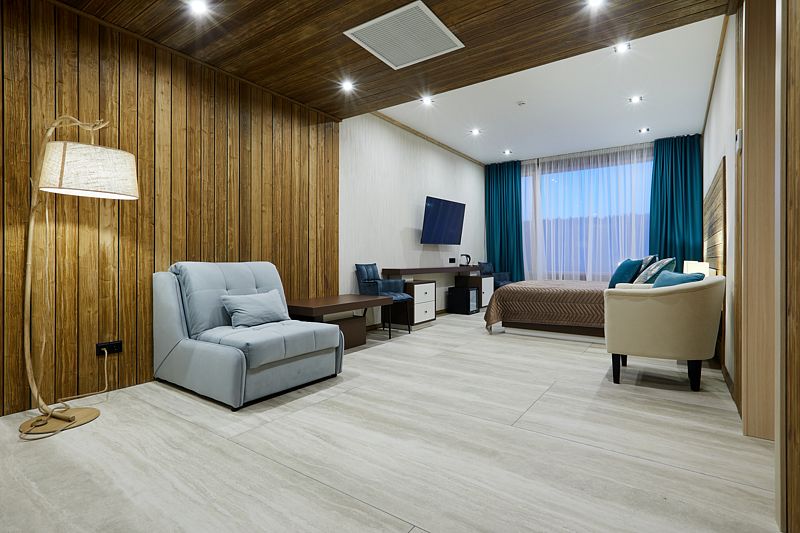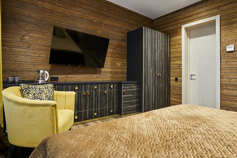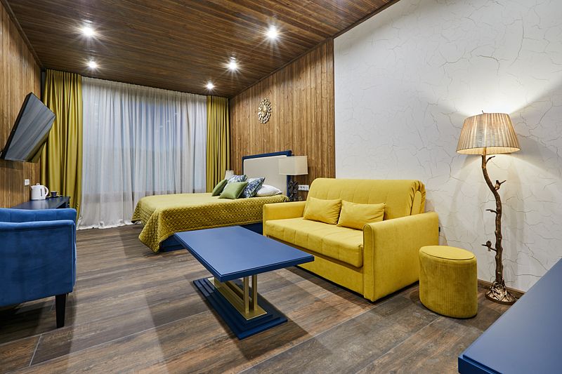 Роскошный двухместный номер с высококлассным дизайнерским ремонтом и дорогой эксклюзивной мебелью, с кроватью размера «king-size» и дополнительным спальным местом раскладным диваном, панорамными окнами и волшебным видом на озеро.