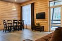 В гостиной зоне установлены два дивана и большой обеденный стол на 8 человек человек, а камин не только поможет согреться в зимние вечера, но и создаст неповторимый уют. Также в гостиной поможет скрасить досуг телевизор с большой диагональю и функцией Смарт ТВ.