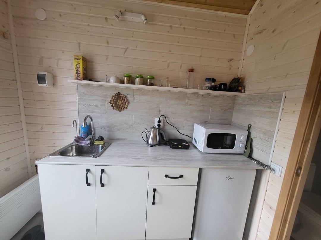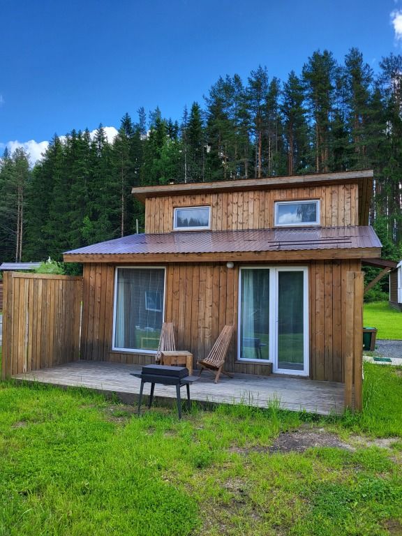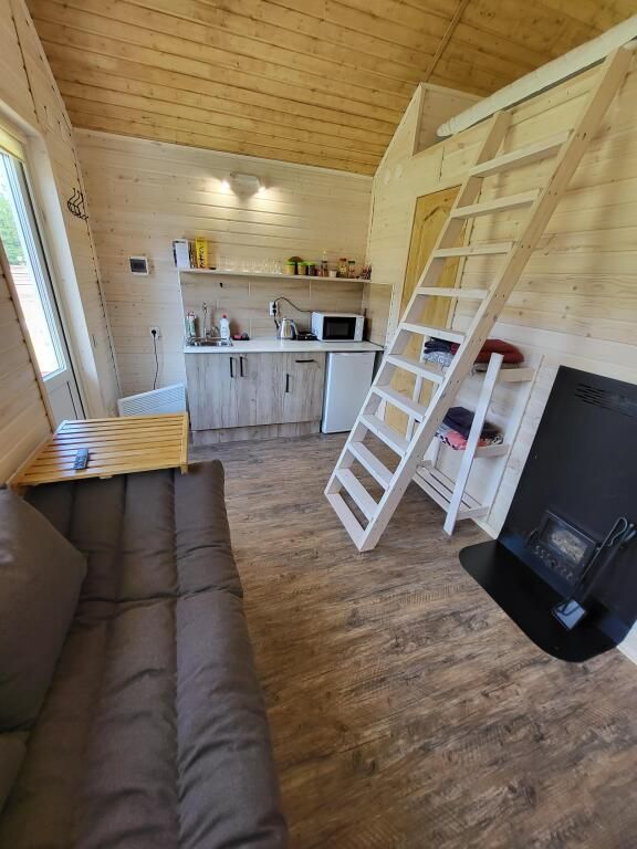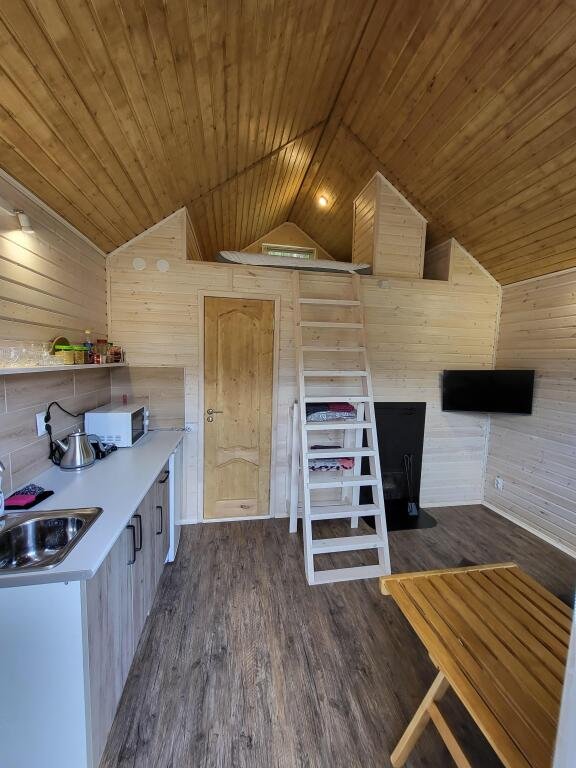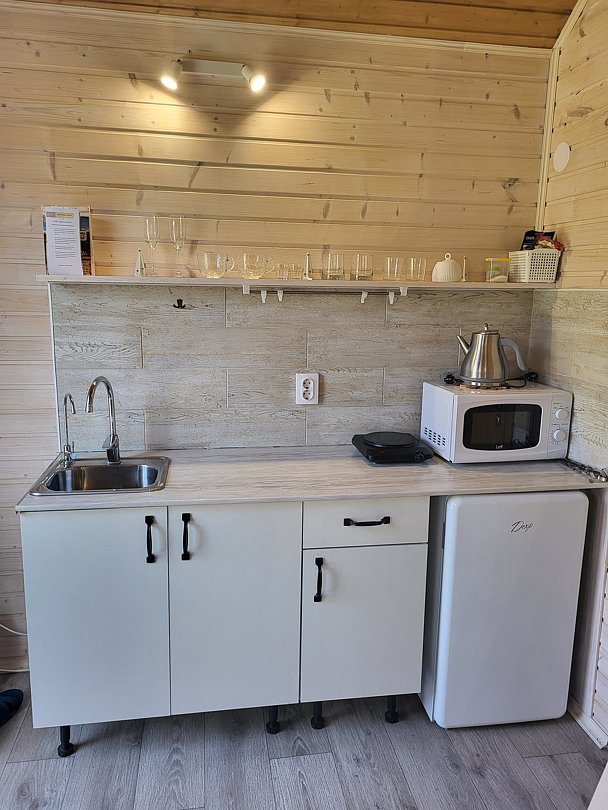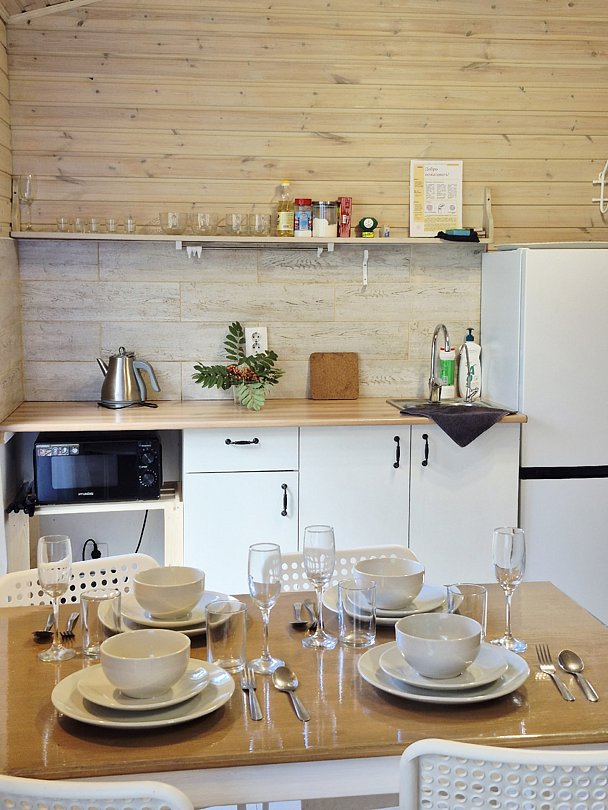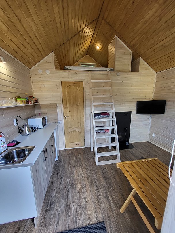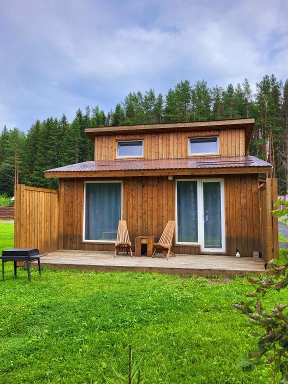 Микро-дом площадью 20 квадратных метров. Главное отличие и преимущество этого домика от других - банька на дровах прямо в доме, которая включена в стоимость. Печь топится из зоны гостиной (как камин). Банька площадью 4 кв. м. На антресольном этаже находится двуспальная кровать. Внимание: лестница на антресольный этаж довольно крутая, просьба учитывать при бронировании! В доме предусмотрен полноценный санузел (душ, унитаз, раковина), есть кухня (микроволновка, чайник, электрическая плитка) и базовая посуда для готовки. У дома своя терраса со стульями, у каждого дома свой мангал (шампура прилагаются).