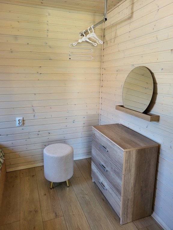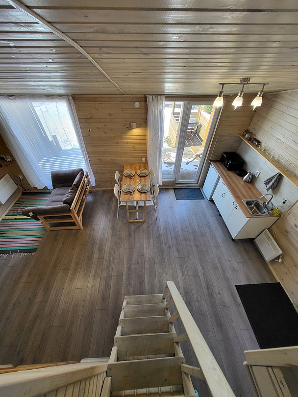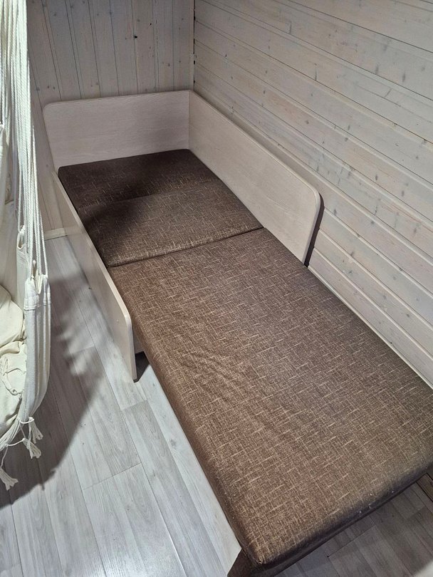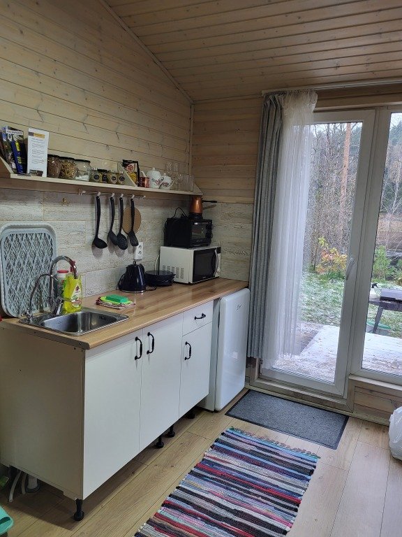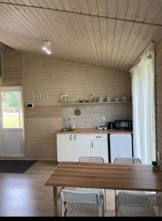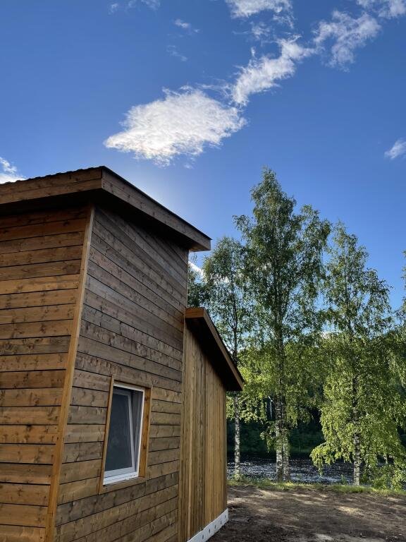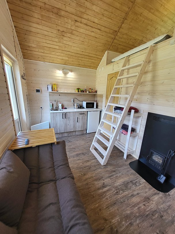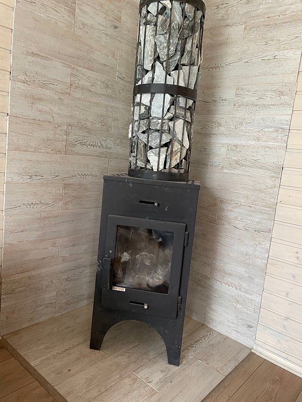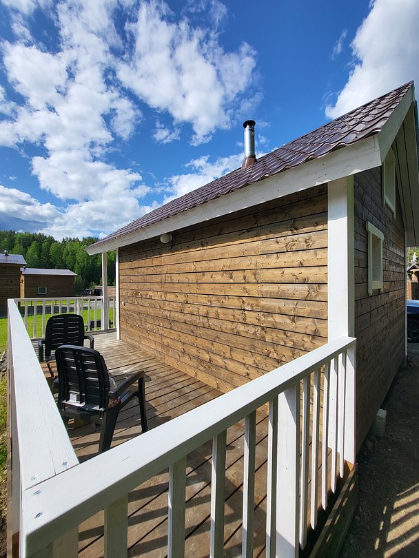 Микро-дом площадью 20 квадратных метров. Главное отличие и преимущество этого домика от других - банька на дровах прямо в доме, которая включена в стоимость. Печь топится из зоны гостиной (как камин). Банька площадью 4 кв. м. На антресольном этаже находится двуспальная кровать. Внимание: лестница на антресольный этаж довольно крутая, просьба учитывать при бронировании! В доме предусмотрен полноценный санузел (душ, унитаз, раковина), есть кухня (микроволновка, чайник, электрическая плитка) и базовая посуда для готовки. У дома своя терраса со стульями, у каждого дома свой мангал (шампура прилагаются).