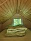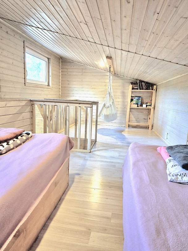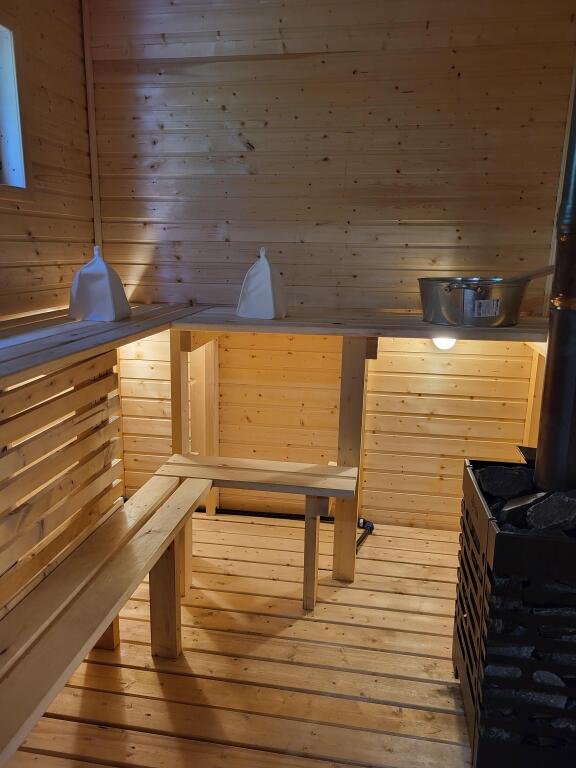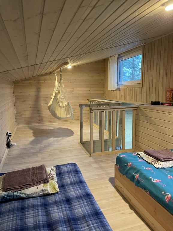 Домик рассчитан на 4-х человек: имеется двуспальная кровать в отдельной спальне, а также 2 односпальные кровати на антресольном этаже. Собственные сауна, санузел, печь, терраса, все необходимое для отличного отдыха: оборудованная кухня (холодильник, чайник, мини-духовка, электрическая плитка, микроволновая печь), посуда, постельное белье, полотенце, фен, мангал с шампурами на собственной террасе, TV со смарт.