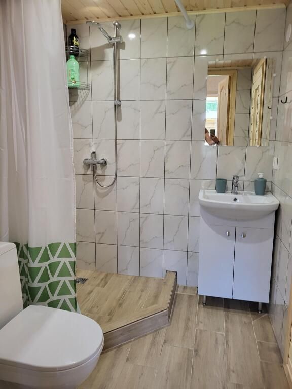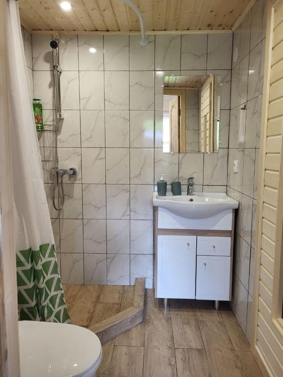 Небольшой домик площадью 20 кв м. Баня на дровах прямо в доме. В доме есть двуспальная кровать, которая расположена на антресольном этаже (обратите внимание: крутой подъем к кровати), а также одноместный диван. В доме есть все для длительного пребывания: холодильник, чайник, плита, набор посуды, телевизор, большая терраса, постельное белье, полотенца. Мангал, шампура. Отдельная парковка.