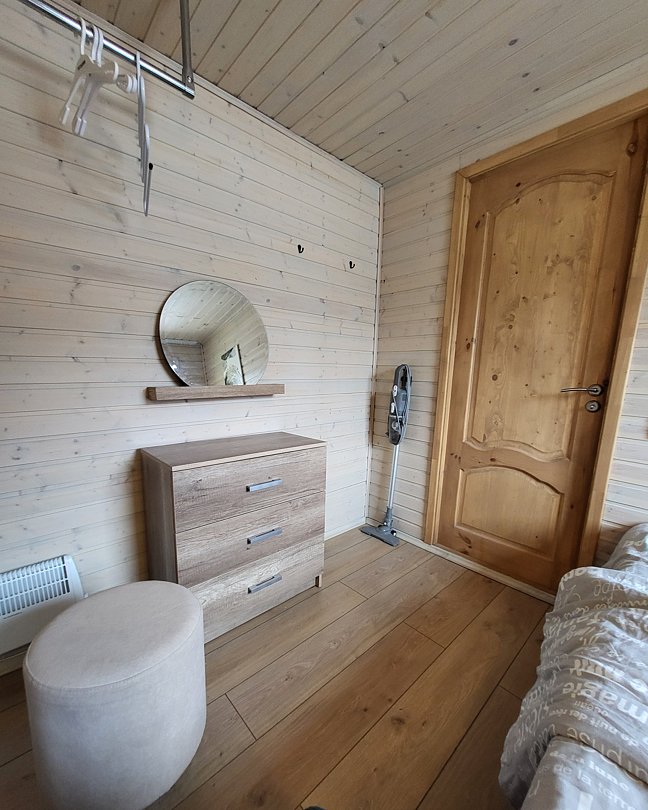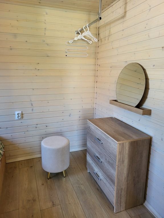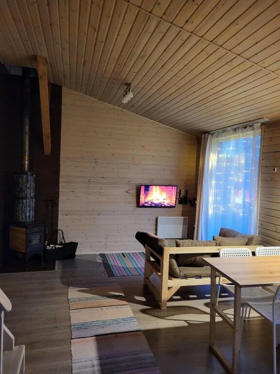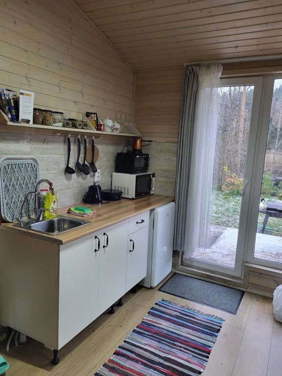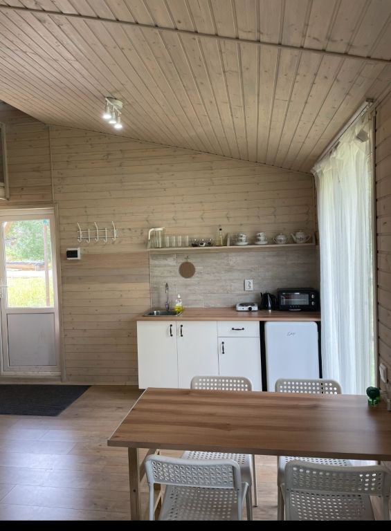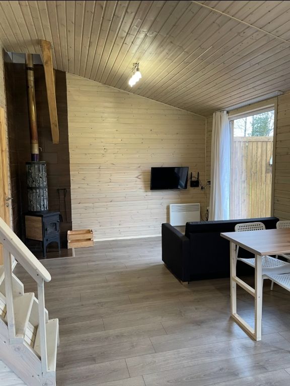 Домик рассчитан на 4-х человек: имеется двуспальная кровать в отдельной спальне, а также 2 односпальные кровати на антресольном этаже. Собственные сауна, санузел, печь-камин, терраса, все необходимое для отличного отдыха: оборудованная кухня (холодильник, чайник, мини-духовка, электрическая плитка, микроволновая печь), посуда, постельное белье, полотенце, фен, мангал с шампурами на собственной террасе, TV со смарт. Отопление конвекторное по системе "умного дома".