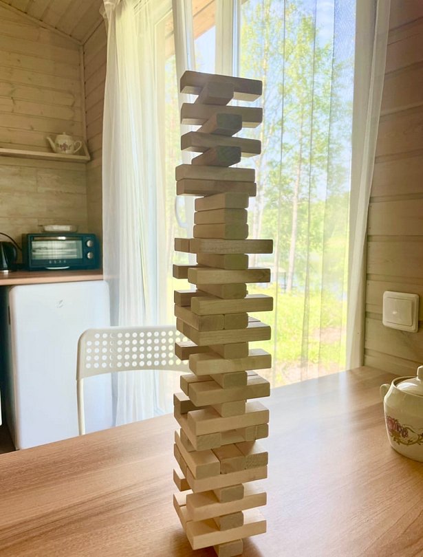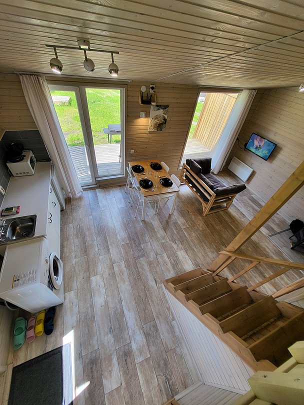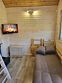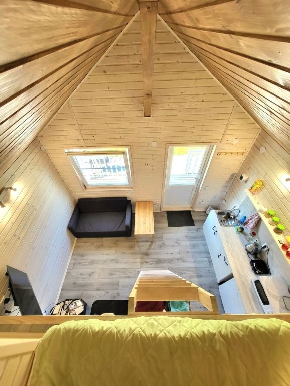 Дом рассчитан на двух человек. На антресольном этаже установлена двуспальная кровать. В доме имеется полноценный санузел (душ, унитаз, раковина), кухня с микроволновой печью, чайником и электрической плиткой, а также базовая посуда для приготовления пищи.
