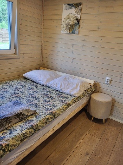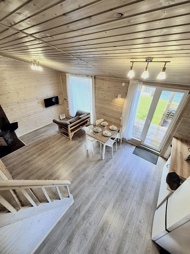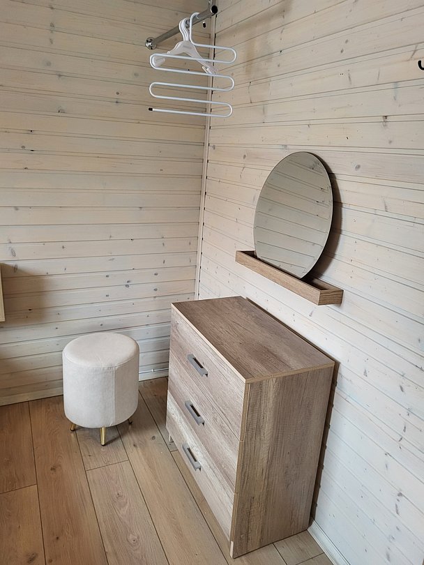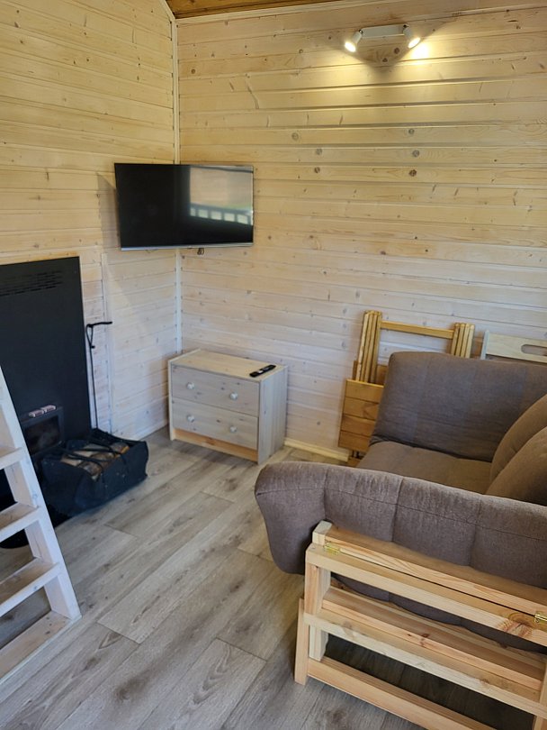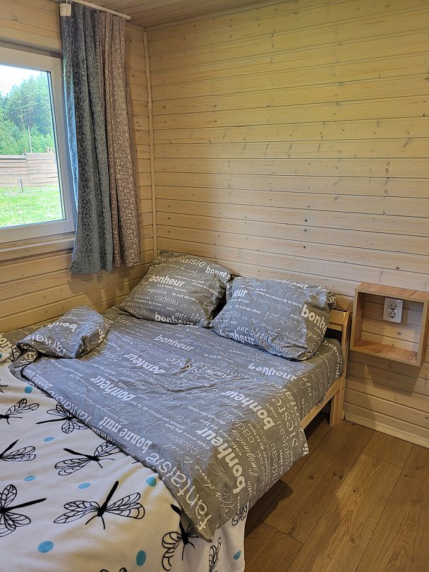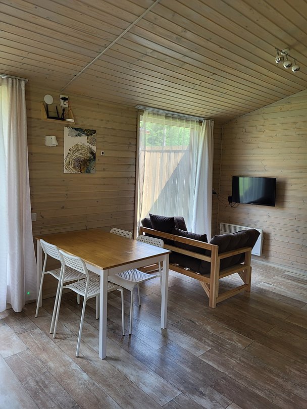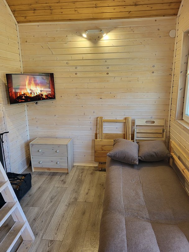 Каждый домик предлагает своим гостям все необходимое для современного отдыха. Внутри вы найдете уютную спальню с двуспальной кроватью, просторный санузел и индивидуальную террасу, оборудованную мангалом для барбекю. Для любителей релаксации предусмотрены сауны или бани на дровах, а также зона отдыха с диваном и смарт-TV, где можно провести время с комфортом.
