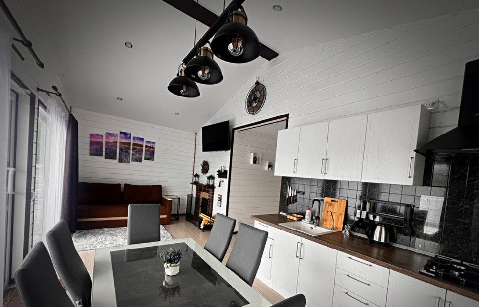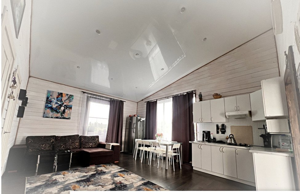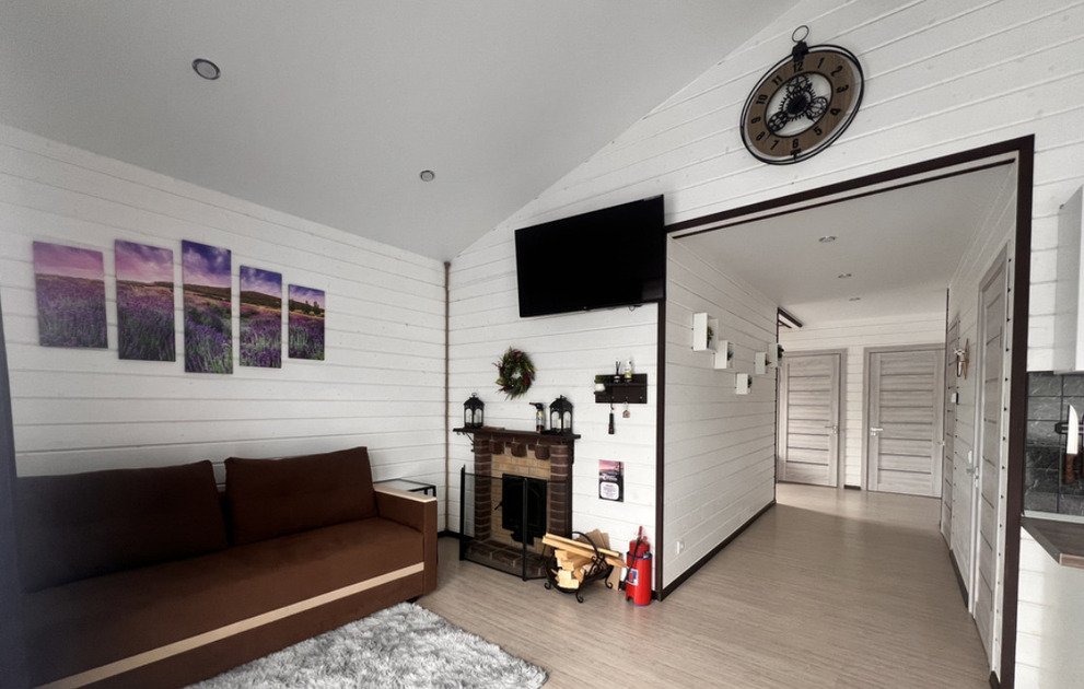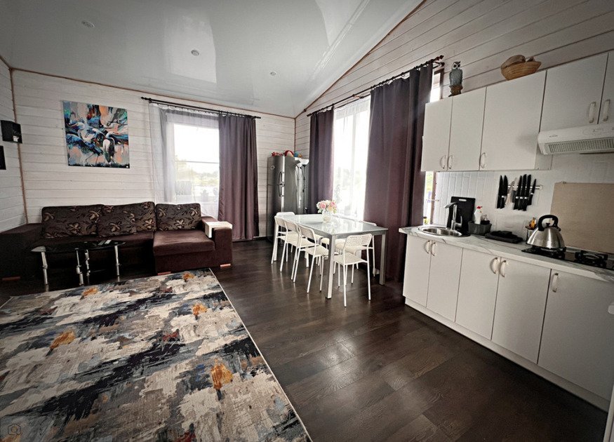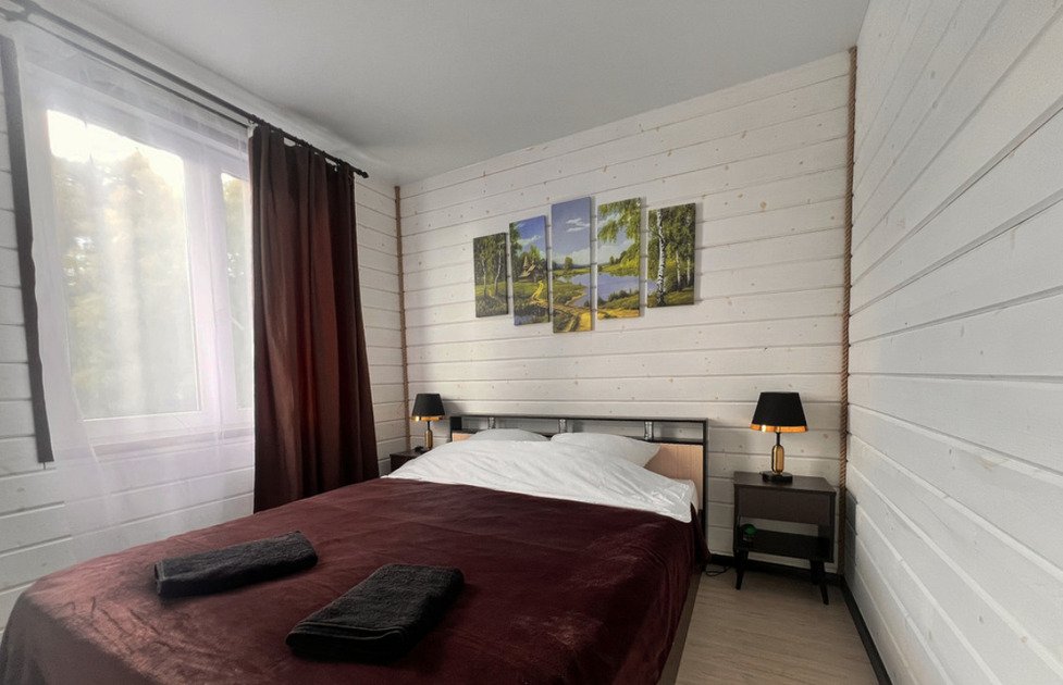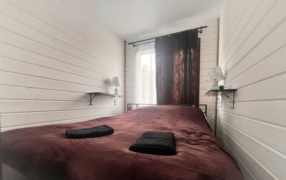 Дом рассчитан до восьми гостей (шесть основных плюс два дополнительных места). Высокие потолки пять метров. Две просторные спальные комнаты, в каждой одна широкая двуспальная кровать (сто шестьдесят сантиметров) и второй ярус — односпальная (девяносто сантиметров). В зале широкий (два с половиной метра) раскладывающийся угловой диван. Комфортно восемь спальных мест.