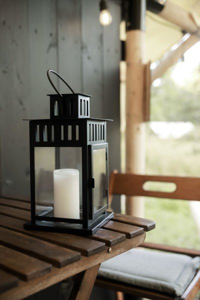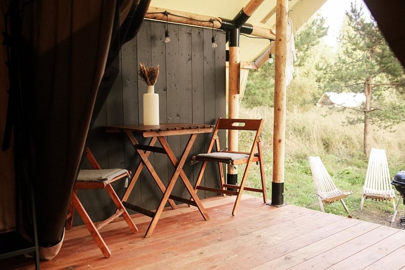 Сафари-тент с увеличенной террасой для двоих — площадью 8х4 метра. Терраса находится на высоте 1,5–2 метра. В них для вашего комфорта теплый пол и ламинат!