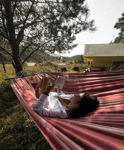 Путешествие с паройПокой на природеЭто почти как дача, но только глубже погружение в природу. Полное ощущение того, что выезжаешь куда-то в лес с палаткой, просто она размером с дом и с кроватью.