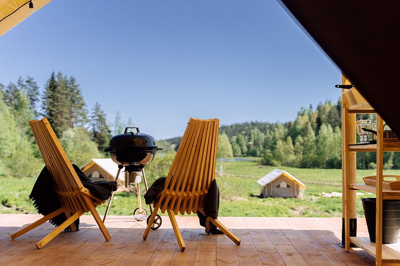 Стильный теплый уютный сафари домик с крытой террасой, рассчитанный на комфортное проживание 2 человек; парковка на 1 машиноместо; Wi-Fi бесплатно (в зоне администрации); горячий душ с туалетом находится в отдельном санитарном блоке в шаговой доступности; площадь сафари-тента: 32 м²; вид на скалы и на Ладожское озеро.