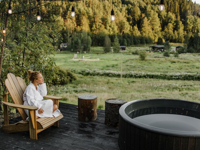 Окунитесь в мир безмятежности в горячей купели Фурако, расположенной на террасе уютных домов Фьорд и в живописном уголке у леса, где установлены сафари-тенты.