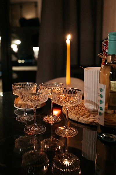 Кухня: мини-холодильник, чайные чашки и блюдца, бокалы для вина, гриль.