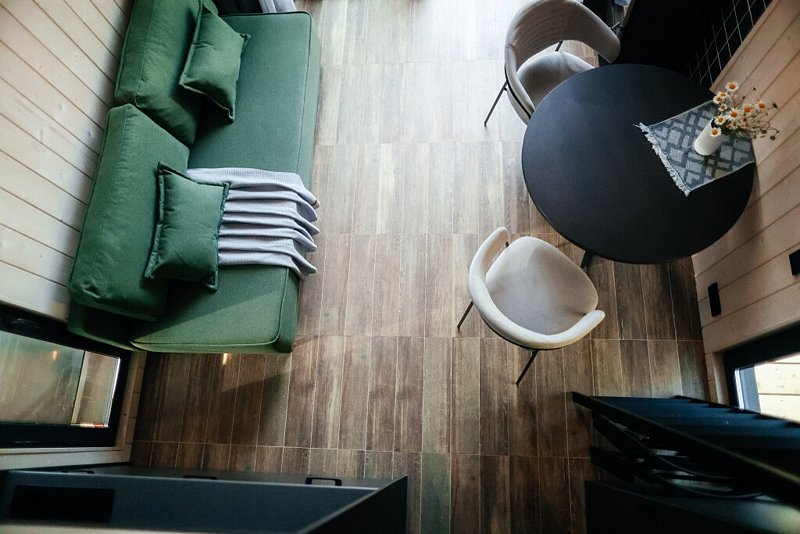 Просторная терраса размером 8х4 метра, расположенная на высоте 2 метра над землёй. Тёплый пол и ламинат способствуют созданию особенного уюта и комфорта, независимо от погоды. Каждый элемент — от ортопедической матраса размером 220х180 с электропростынью до эффективных обогревателей — спроектирован для максимального удобства.