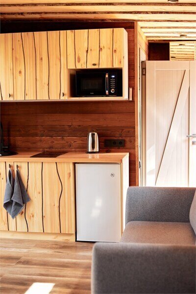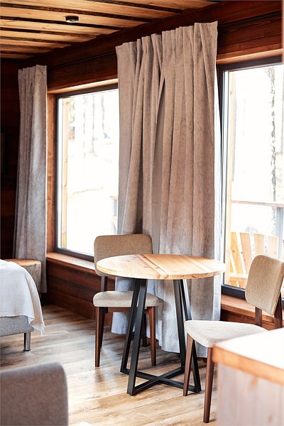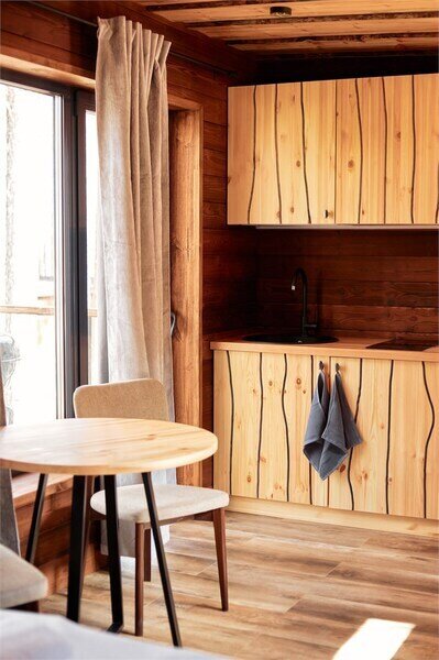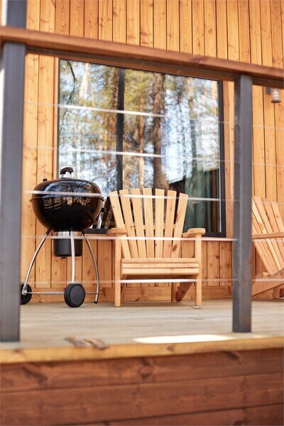 угловой диван-кровать, две односпальные или большая двуспальная кровать, телевизор с плоским экраном, ванна или душевая кабина, раковина, санузел, сауна, теплый пол, гардеробная, вешалки, стулья, окна от пола до потолка, стол, шкаф для одежды, обеденный стол, свч-печь, холодильник, кондиционер, плита для приготовления пищи. Терраса. Вид на озеро/вид на лес. Отдельный вход в номерУслуги и удобства
