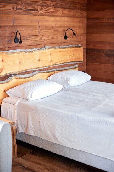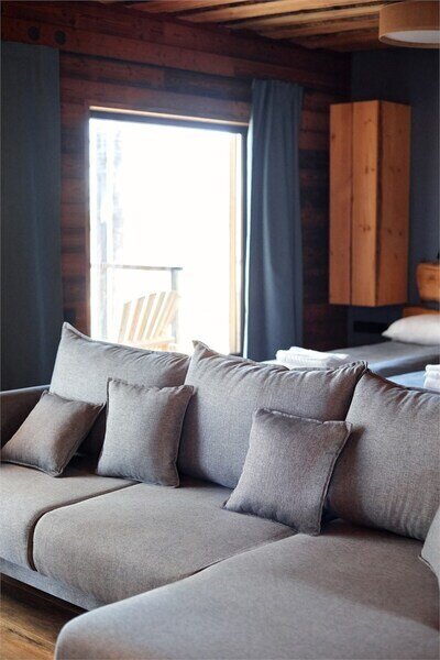 две односпальные или большая двуспальная кровать, диван-кровать, телевизор с плоским экраном, ванна или душевая кабина, раковина, санузел, гардеробная, вешалки, затемняющая штора, окна от пола до потолка, стол, свч-печь, холодильник, кондиционер. Терраса, вид на озеро/вид на лес. Отдельный вход в номерУслуги и удобства