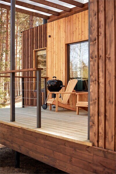 В нем возможно размещение четырех человек, с односпальными кроватями, большим угловым диваном и камином. Удобная кухня со всем необходимым для приготовления пищи. Обеденная зона. TV, WI-FI. В доме большой санузел с душевой и финская сауна. Своя терраса с видом на озеро и своя зона барбекю. Очень комфортный для длительного проживания.