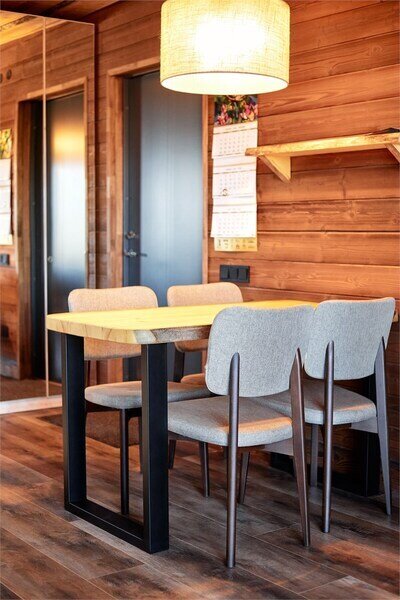 Просторный двухэтажный дом, в котором комфортно разместятся 10 человек и два человека на дополнительных местах с большими панорамными окнами.