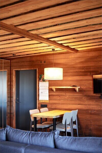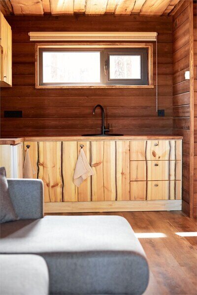 Дом, в котором кухня-студия и отдельная спальня с большими панорамными окнами с видом на озеро. Очень удобный и комфортный. В нем разместятся до 4-х человек.