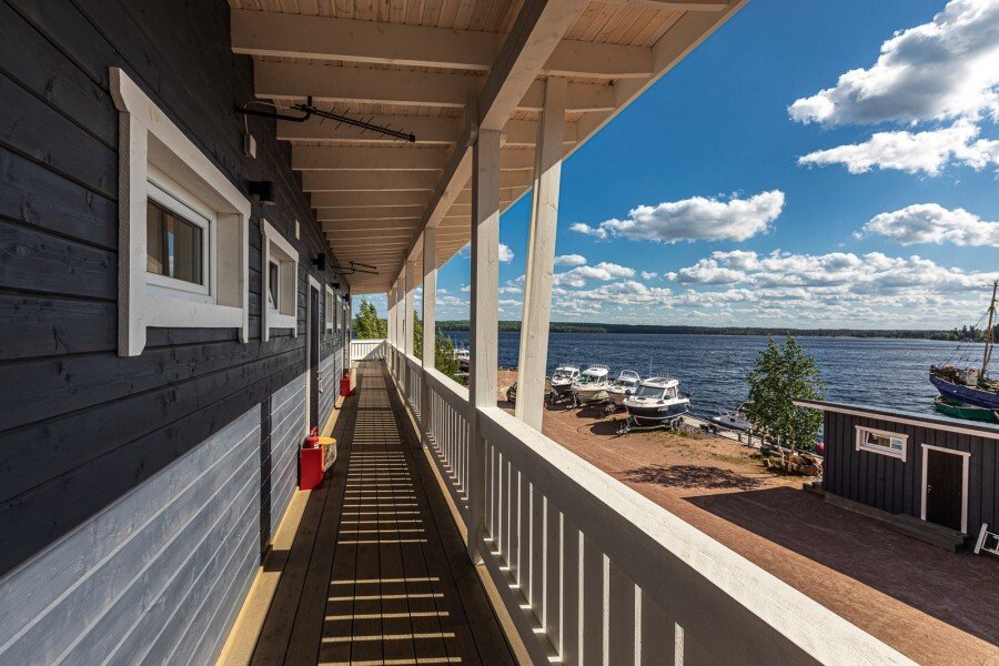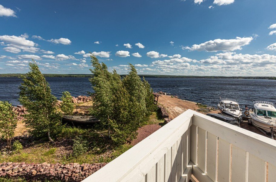 Апартаменты расположены на территории Рыбацкого причала и выполнены в норвежском стиле с использованием экологически чистых, натуральных материалов. Площадь 21,8 м². Вам откроется прекрасный панорамный вид на бухту Онежского озера и единственное на планете месторождение шокшинского малинового кварцита.