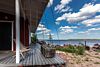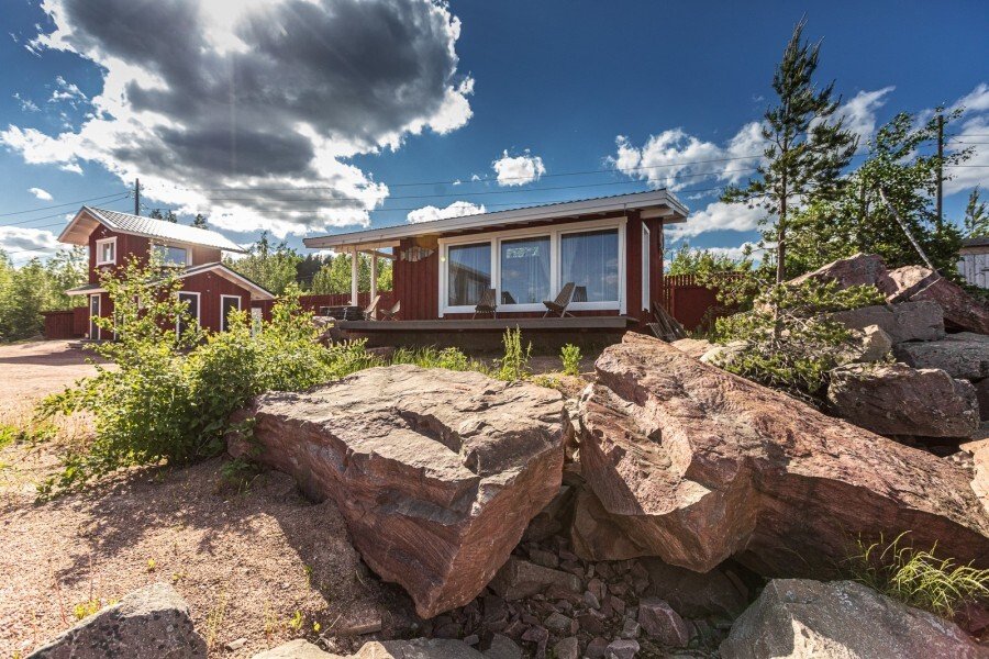 Площадь дома 24 м². Панорамное остекление, терраса с зоной отдыха. Из окон открывается потрясающий вид на бухту Онежского озера и месторождение шокшинского малинового кварцита.