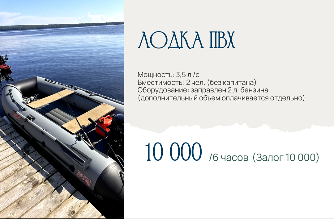 Есть свой причал для слипа (спуска катеров на воду), швартовки, стоянка катеров, а также аренда маломерных транспортных средств для прогулки по водоему и рыбалки. Организованы индивидуальные экскурсии на катерах на о. Кижи, о. Бесов Нос, к Муромскому монастырю.