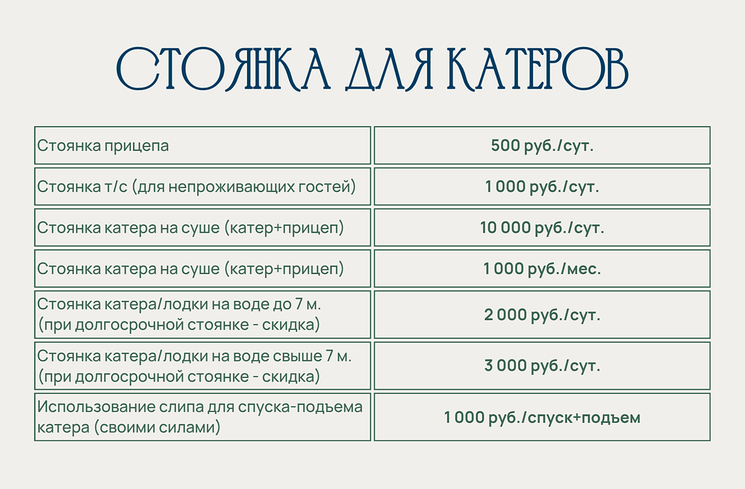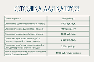 База отдыха «Рыбацкий причал» предоставляет владельцам катеров, лодок и яхт услуги стоянки, слипа для спуска и подъема судов, а также электроснабжения. Все эти услуги доступны при предварительном бронировании и согласовании.