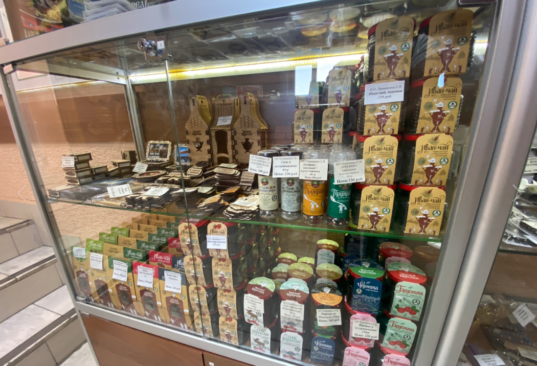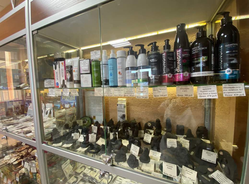 В продаже имеется уходовая косметика с добавлением шунгита для лица, тела, волос, сувениры из карельского шунгита. Фигурки из шунгита, украшения, изделия из бересты, магнитики и изделия из дерева, куклы и обереги ручной работы, сумочки, чай и варенье, футболки и даже картины о природе художника-любителя Ильи Калинина!