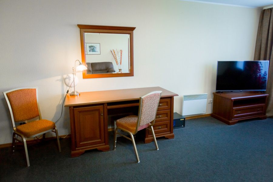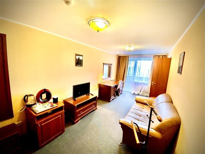 В номере имеется: мягкая мебель (раскладной 2-х спальный диван), рабочий письменный стол, холодильник, ТВ, WI-FI, кофеварка, электрический чайник, набор посуды, фен.