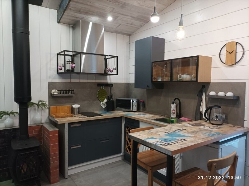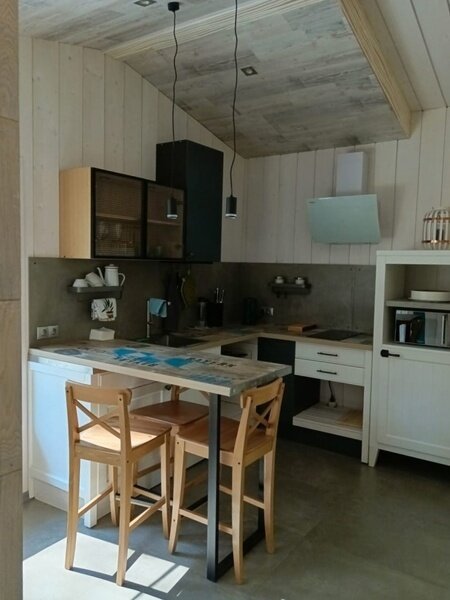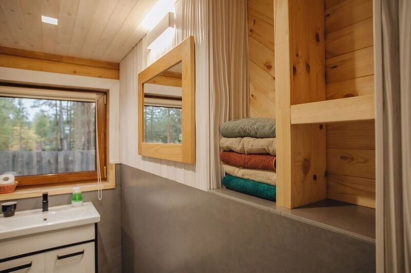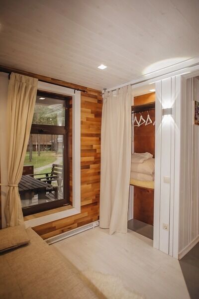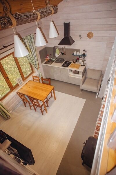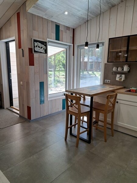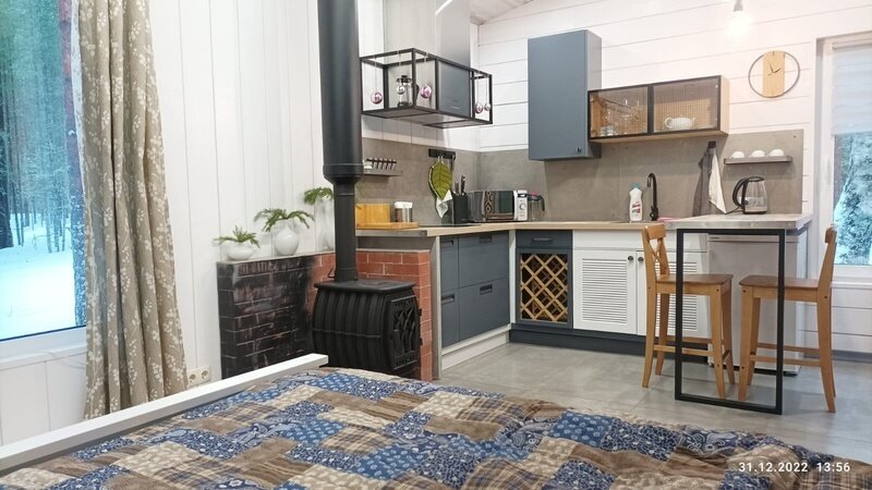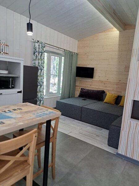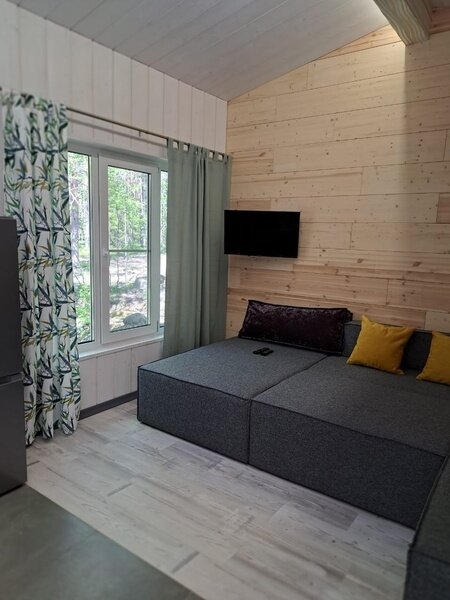 Домик с открытым внутренним пространством и панорамными окнами. Внутри есть все необходимое для комфортного проживания: