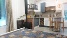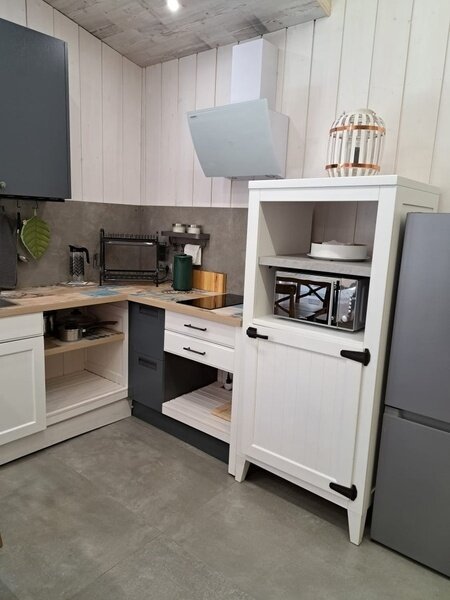 - кухонная зона максимально укомплектована (эл.плита, микроволновка, чайник, посуда, столовые приборы, бокалы, чайный сервиз, средства для мытья посуды)