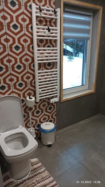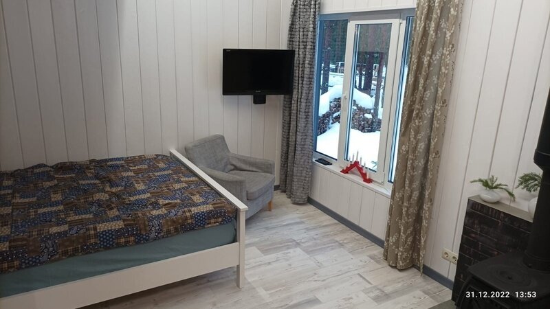 В доме на 1 этаже расположены кухня, гостиная с удобным раскладывающимся диваном и две спальни с большими 2-х спальными кроватями и комодами.