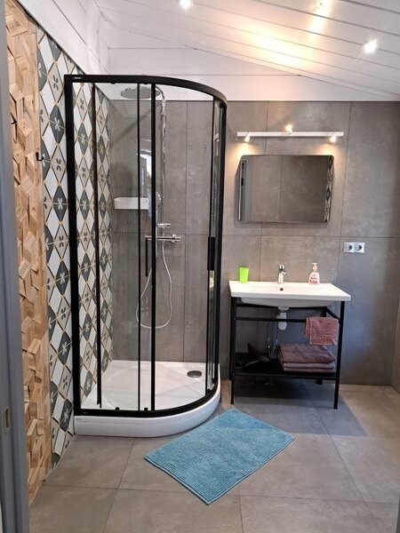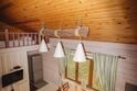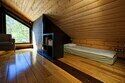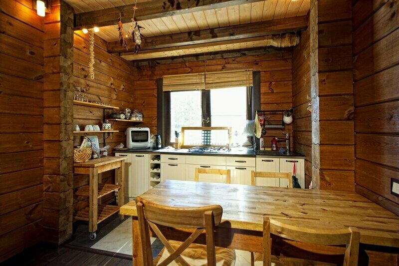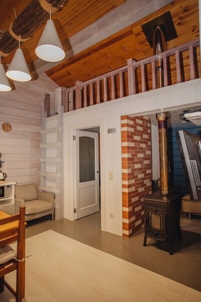 В доме на 1 этаже расположена оборудованная кухня со столом, микроволновой печкой, газовой плитой, чайником, посудой. Сан. узел с душевой кабиной. Гостиная с удобным раскладывающимся диваном, спутниковое телевидение, дровяной камин. Две спальни с большими 2-х спальными кроватями и комодами.