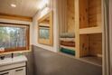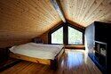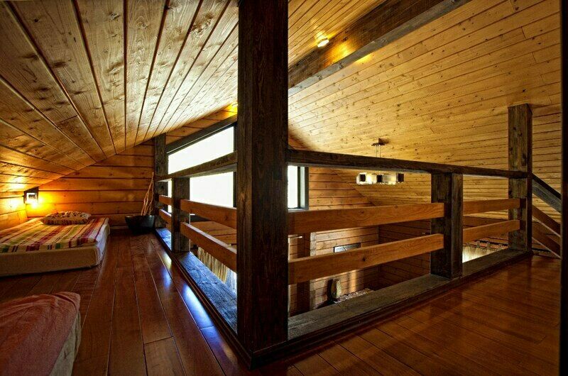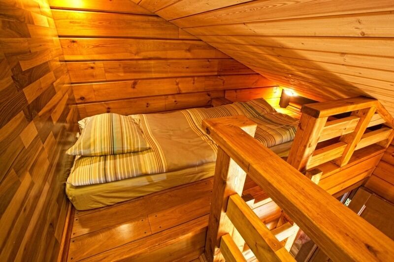 На 2 этаже расположена спальня с 2-х спальной кроватью и шикарным видом на территорию базы через большие окна во всю стену.