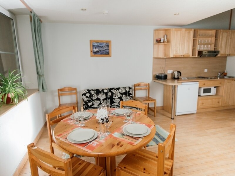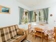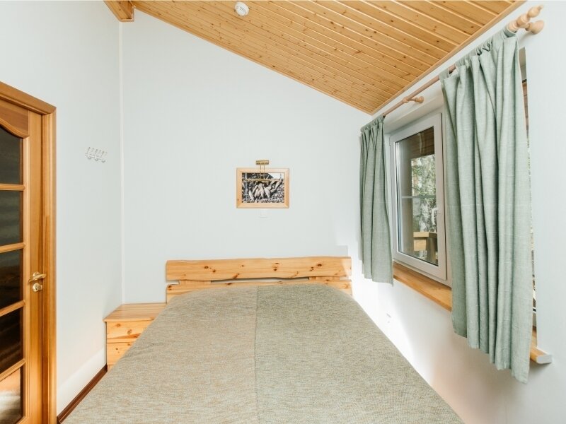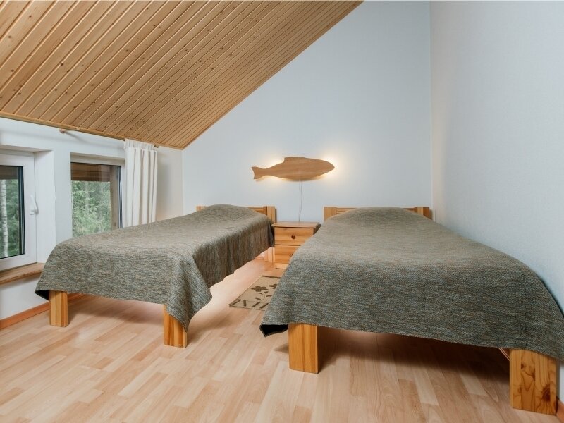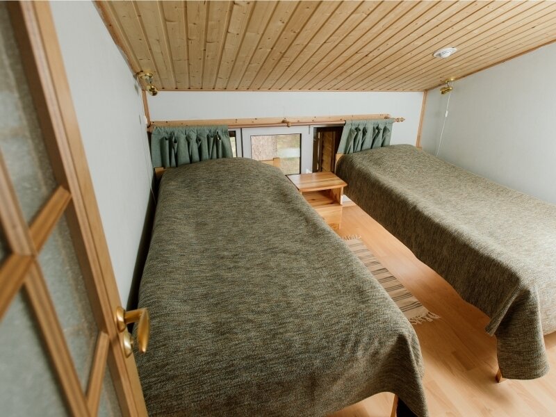 Расположены в коттедже в двух уровнях. 4-х местное размещение. Первый уровень: Гостиная с мягкой мебелью и камином, телевизор LCD с DVD (цифровое ТВ), магнитола MP3. Зона кухни, оборудованная техникой: электрическая плита, микроволновая печь, электрический чайник, кофеварка, тостер, холодильник. Набор кухонной и столовой посуды. Электрическая сауна (технология сауны не позволяет использование веников), душевая, туалетная комната с феном. Второй уровень: Две спальные комнаты, в каждой по 2 односпальные кровати. Комнаты оснащены мебелью из экологически чистой карельской сосны. Отопление: камин, эл. обогреватели, «теплые полы». Водоснабжение: горячая и холодная вода (подача горячей воды из бойлера). Апартаменты оснащены лестницей яхтенного типа.