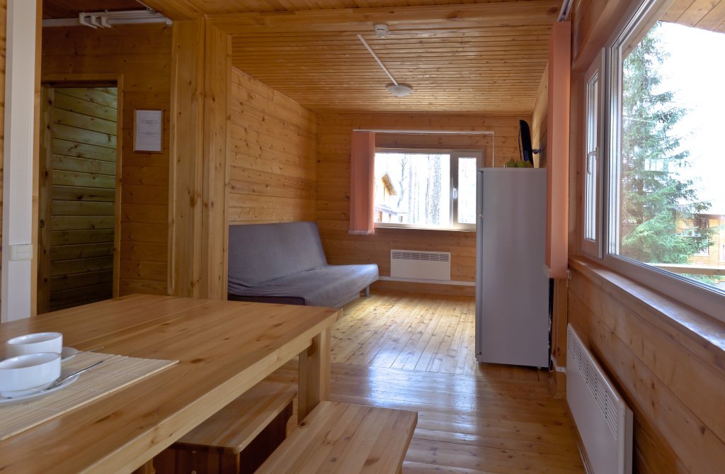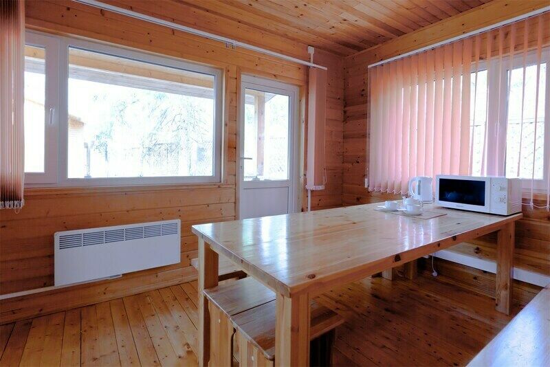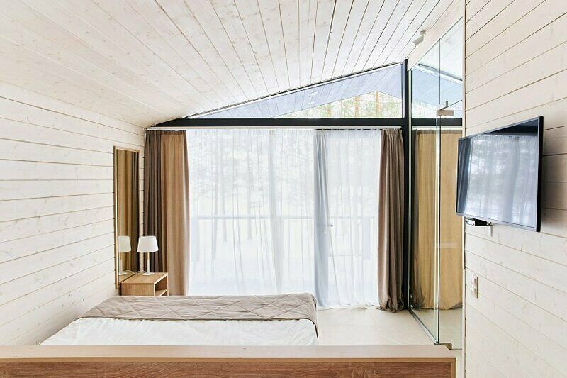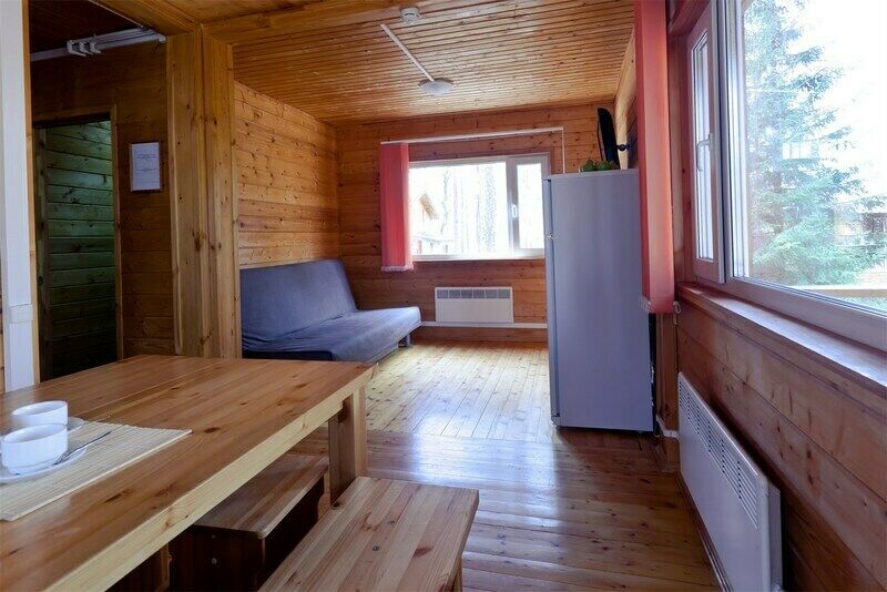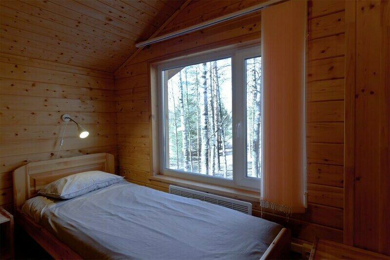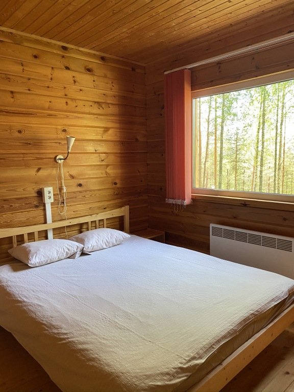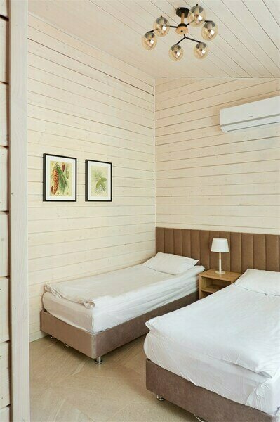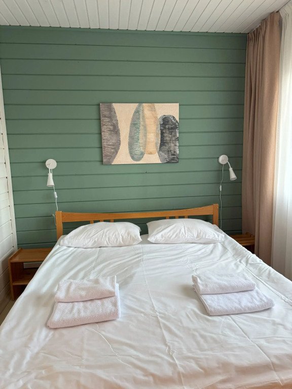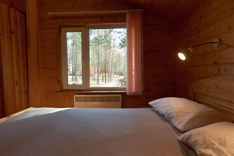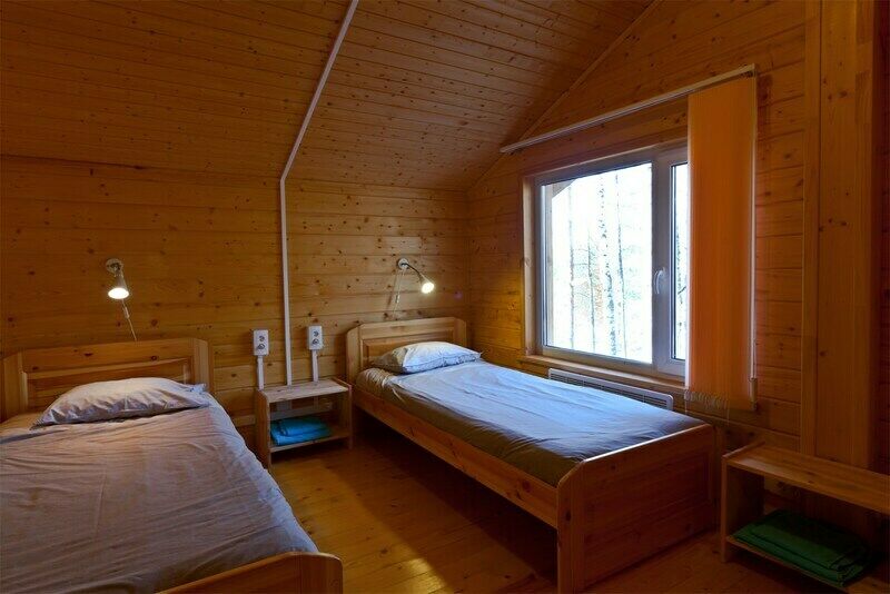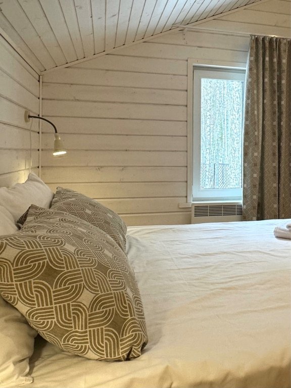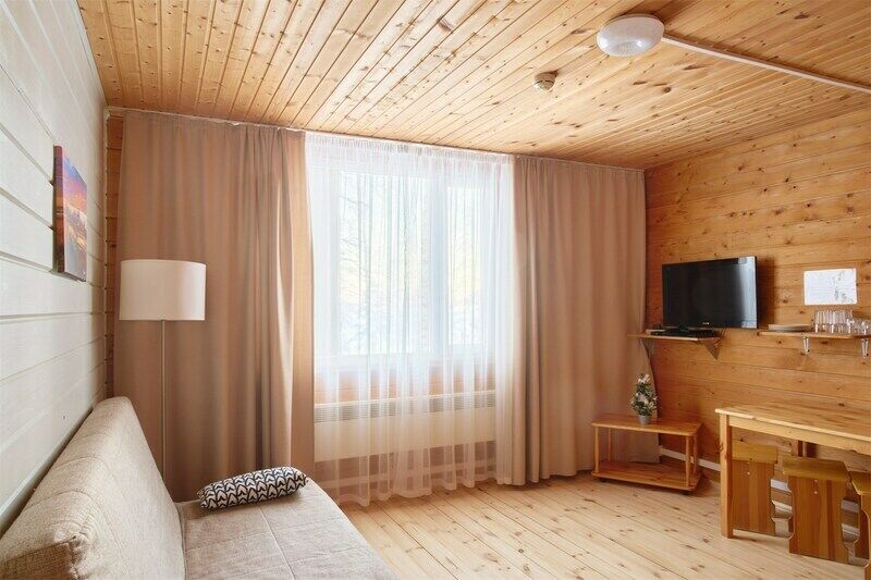 Номер в гостинице точно как на фотографиях в интернете. Уютно. Когда только заходишь, ощущается приятный запах дерева, а на территории самой базы пахнет лесом. Всё очень чисто, аккуратно, красивый вид из окна!