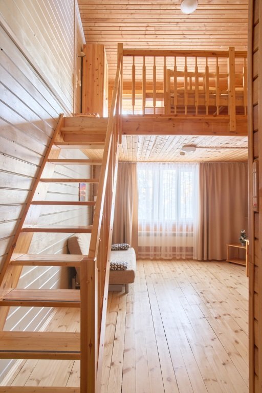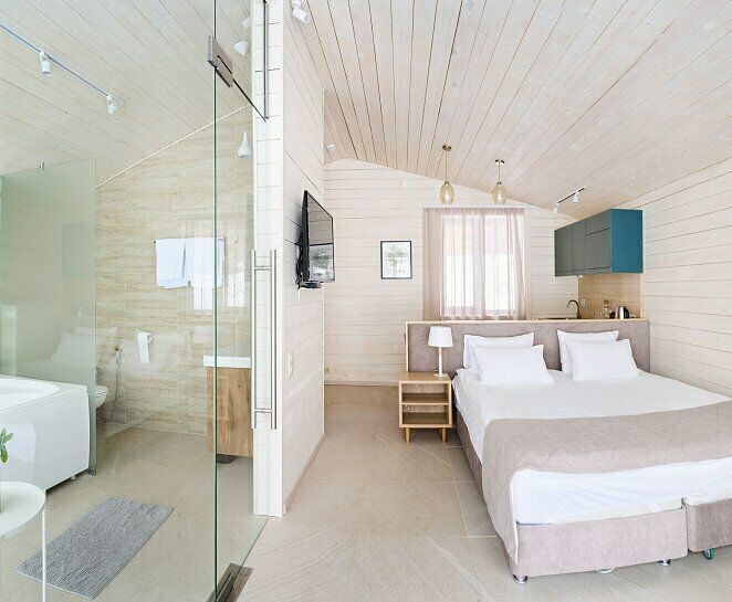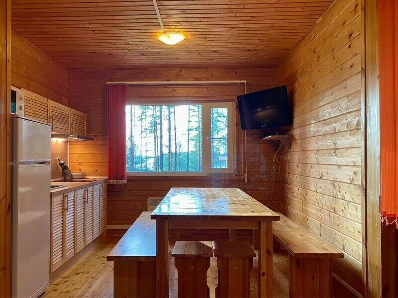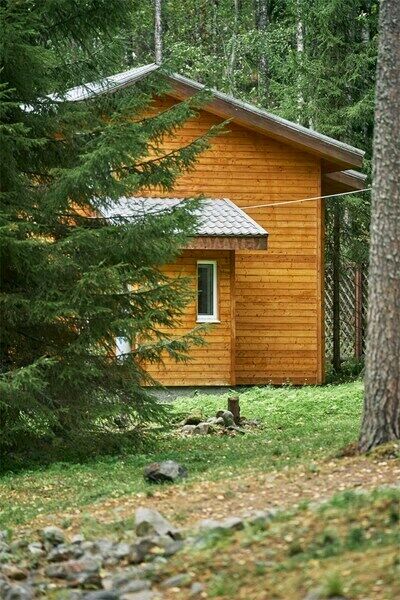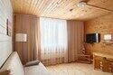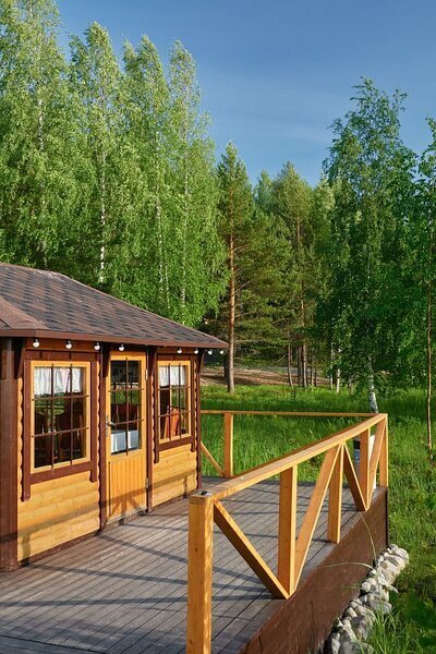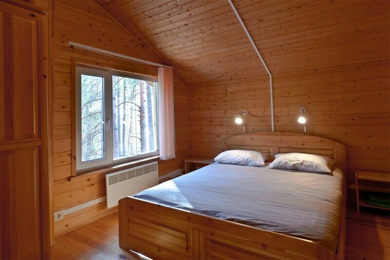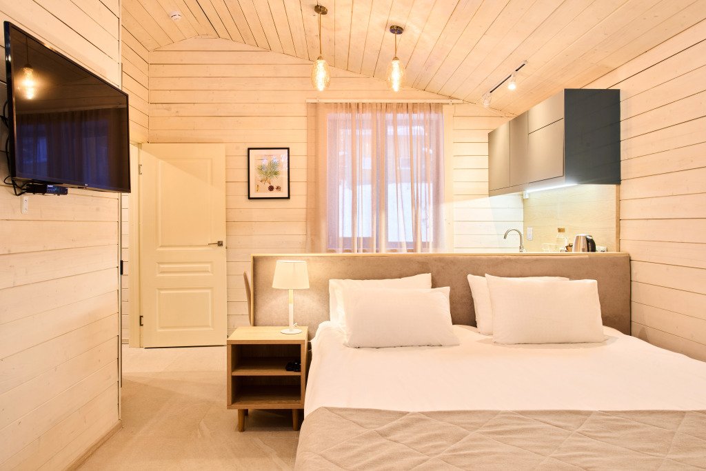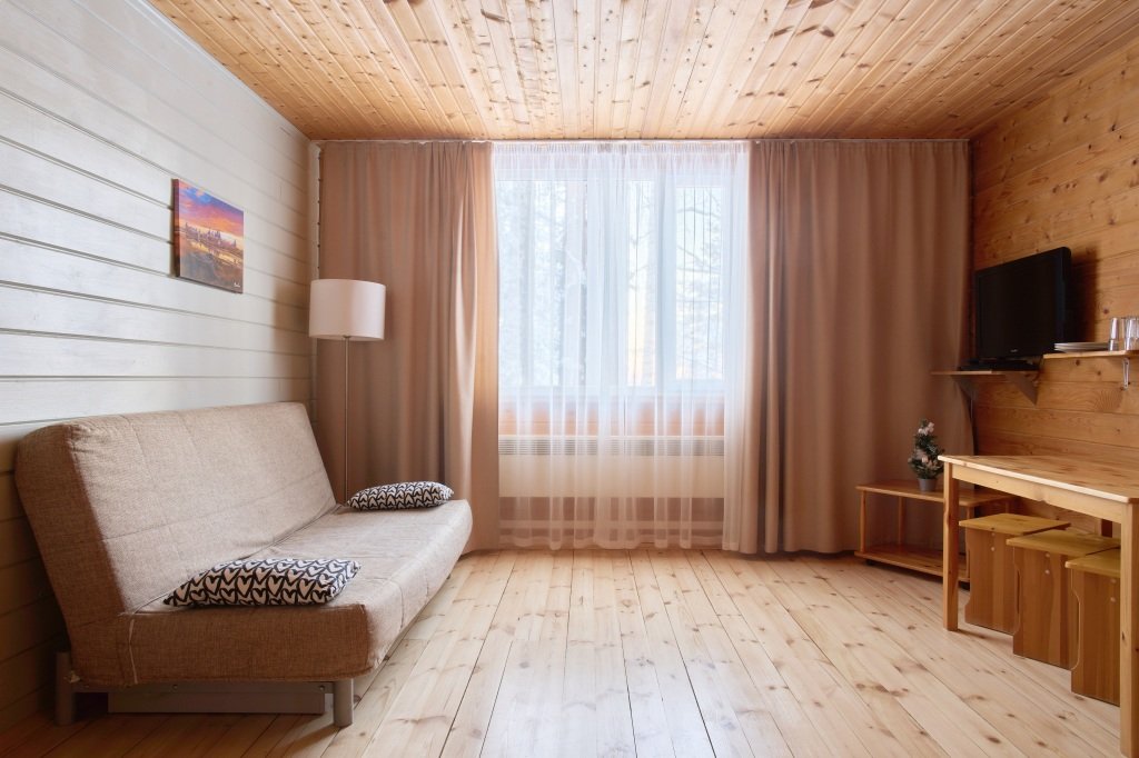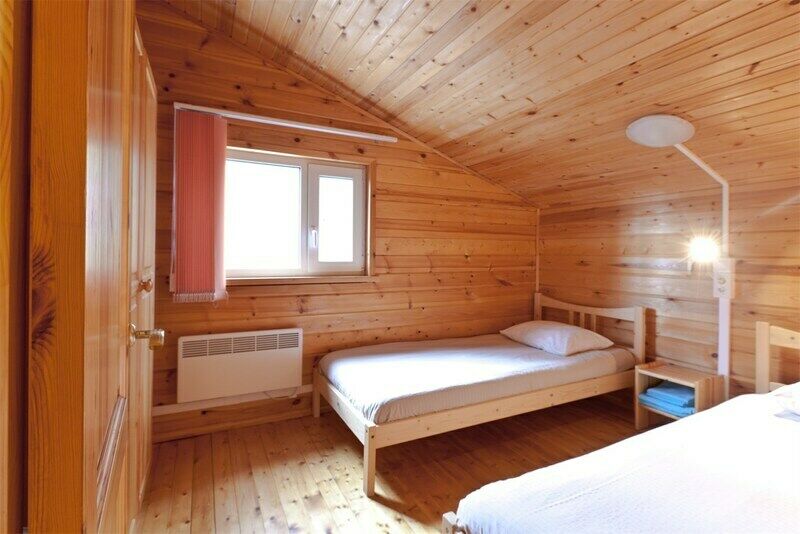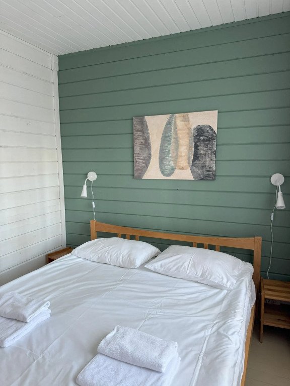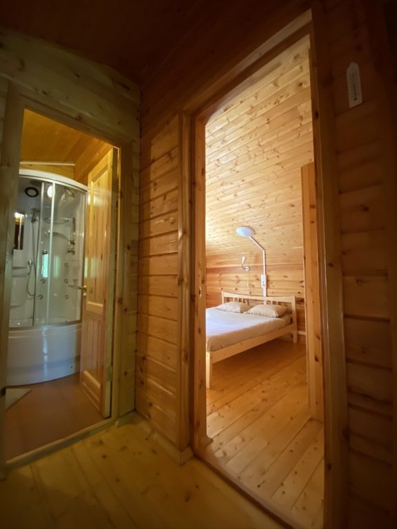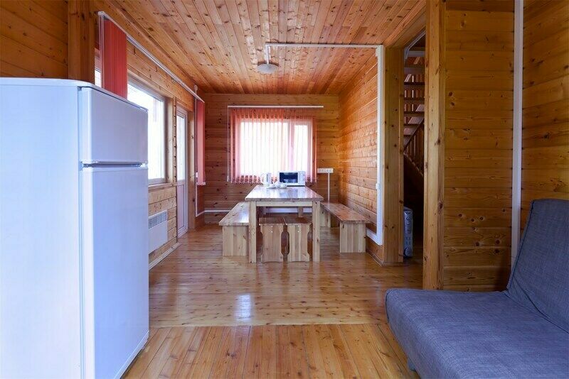 Номер в гостинице точно как на фотографиях в интернете. Уютно. Когда только заходишь, ощущается приятный запах дерева, а на территории самой базы пахнет лесом. Всё очень чисто, аккуратно, красивый вид из окна!