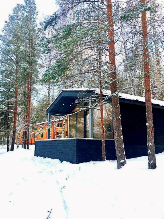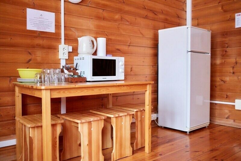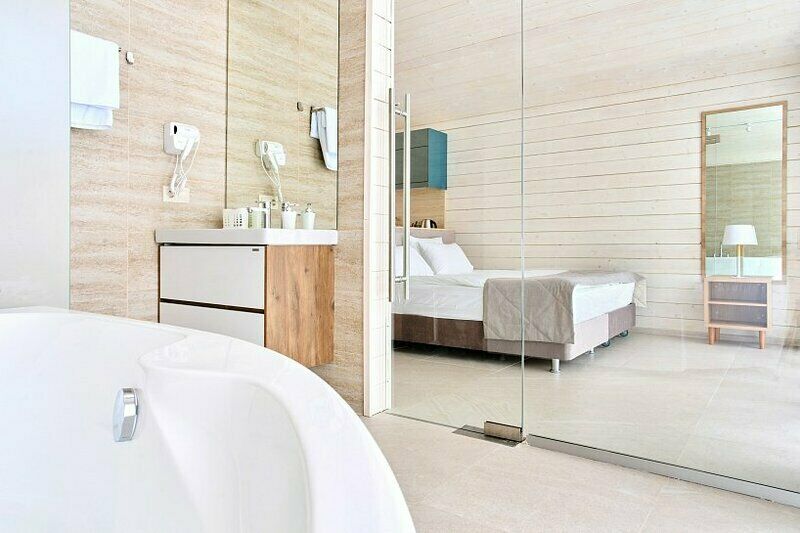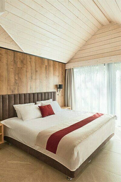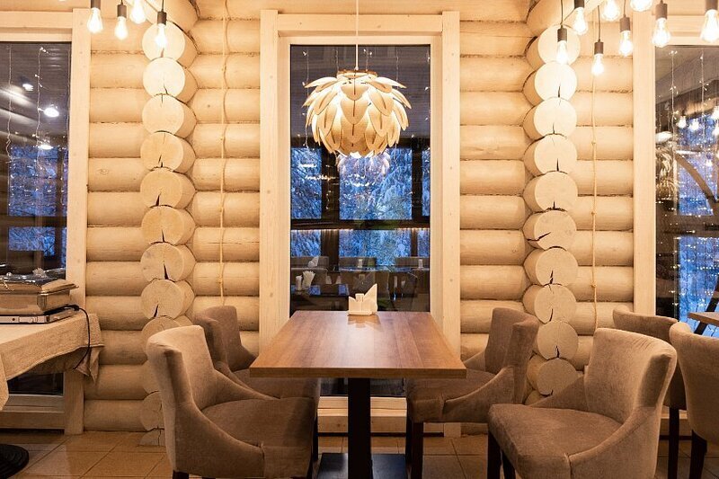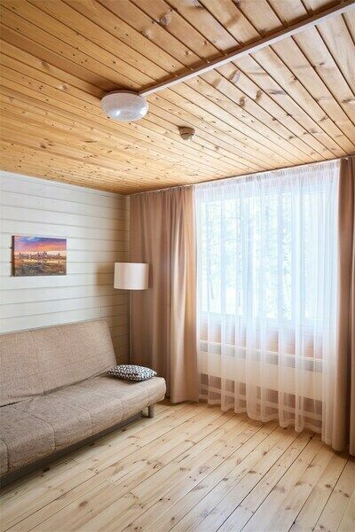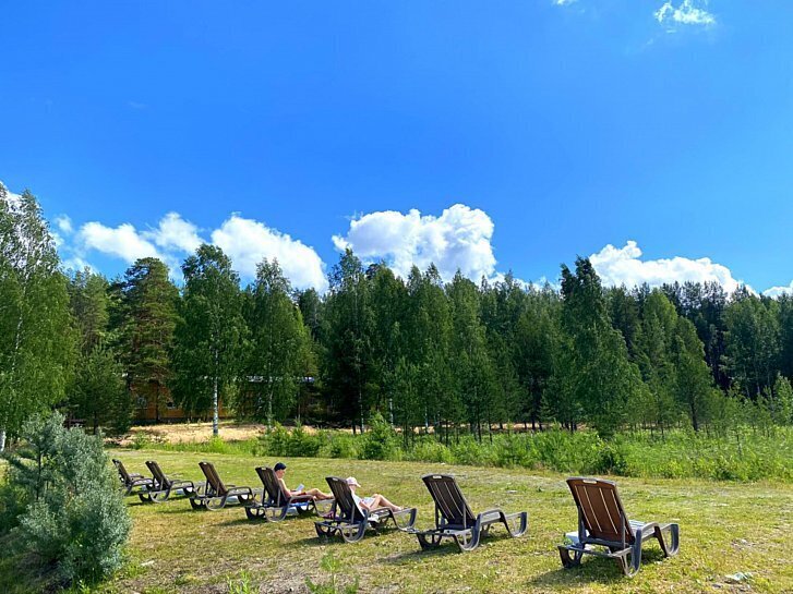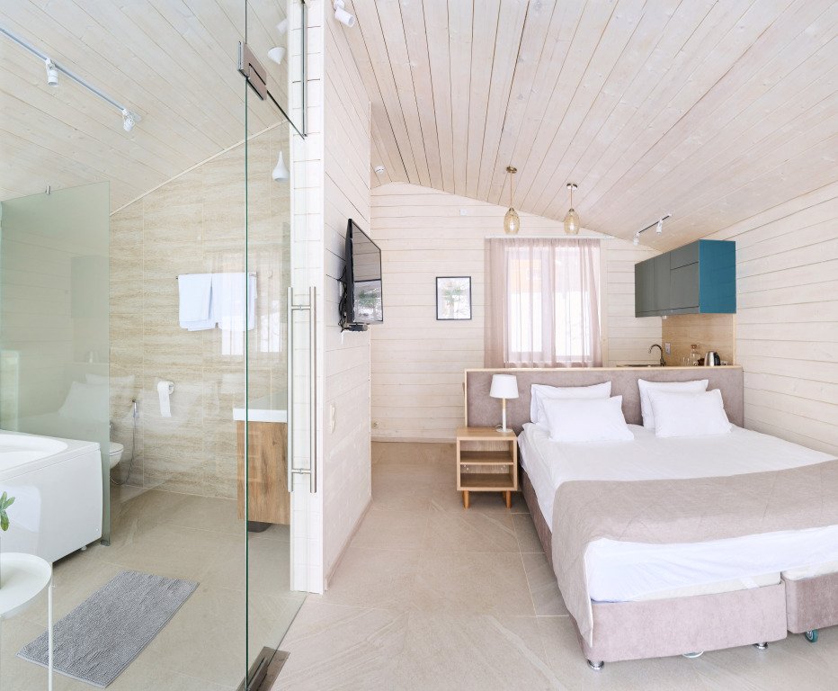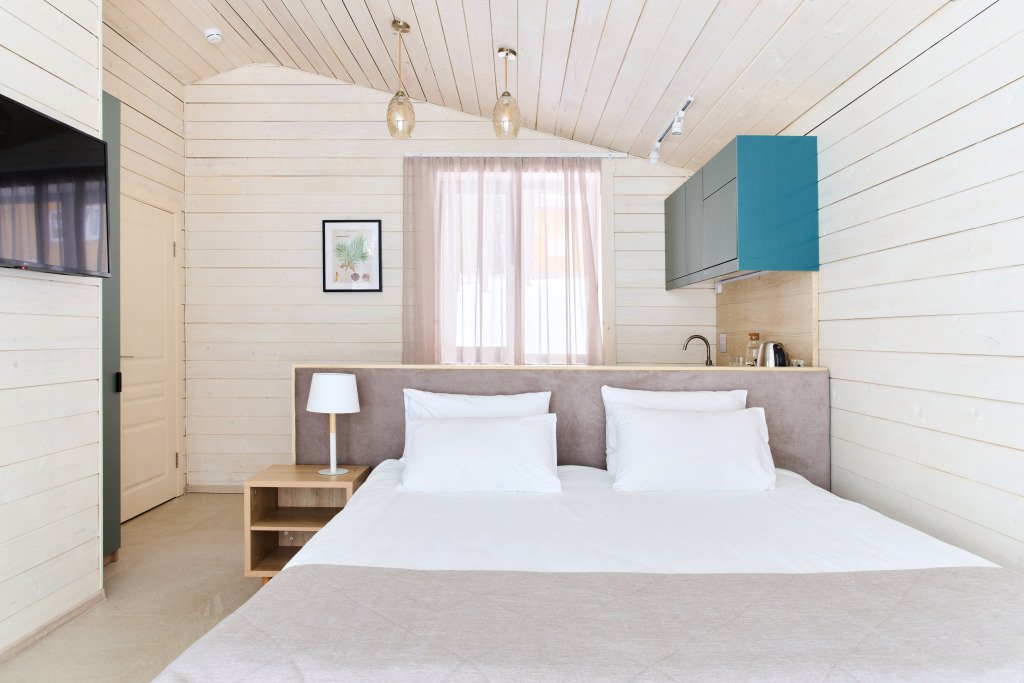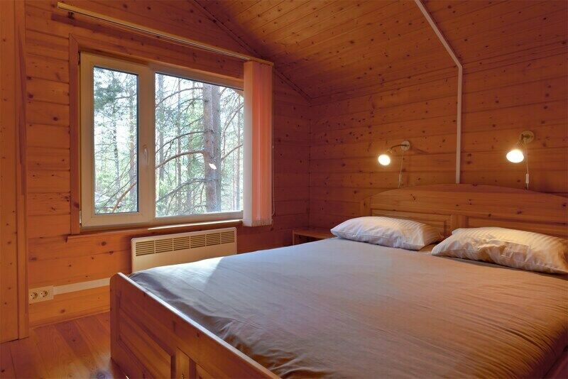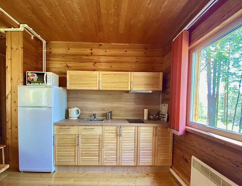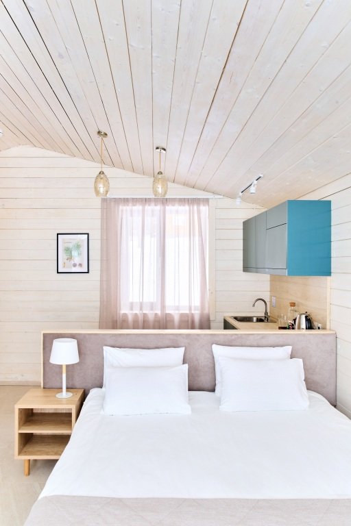 Номер в гостинице точно как на фотографиях в интернете. Уютно. Когда только заходишь, ощущается приятный запах дерева, а на территории самой базы пахнет лесом. Всё очень чисто, аккуратно, красивый вид из окна!