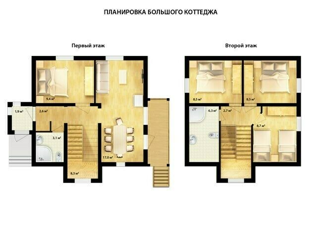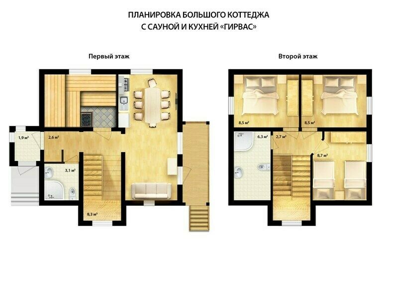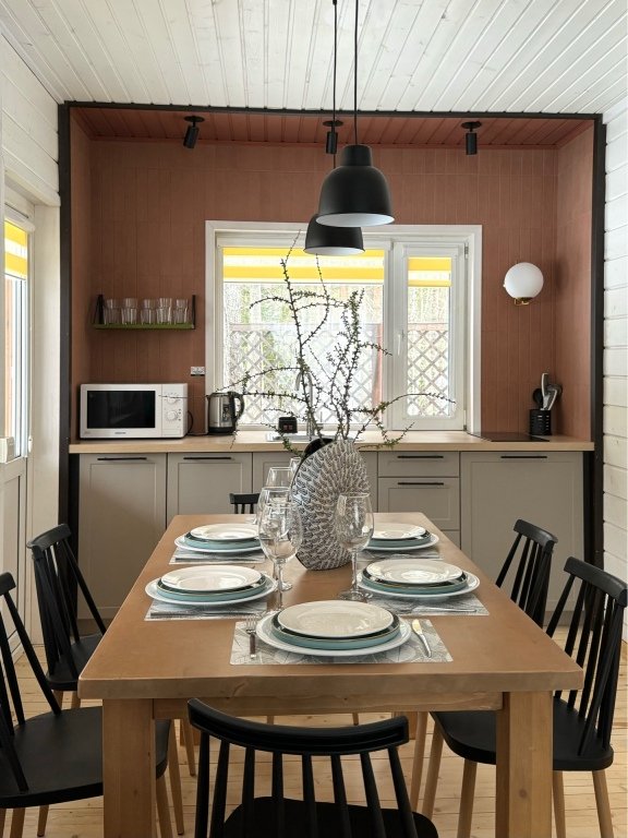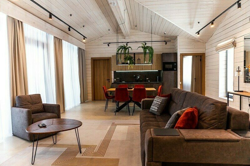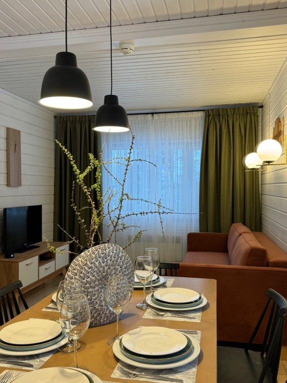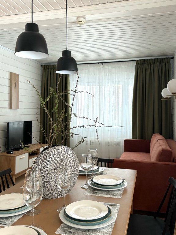 Для любителей провести свой отпуск или выходные в тёплой компании или большой семьёй на территории базы отдыха расположено 8 коттеджей разной вместимости, в которых единовременно, с комфортом, может разместиться до 76 человек.