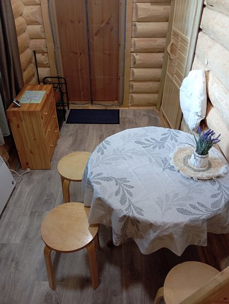 Дом отапливается системой теплонакопителей, теплый пол в санузле и даже в лютый мороз — в домике тепло и уютно. В доме кухня; санузел, 1 комната и кровать-чердак, то есть двухэтажная конструкция, на 2 этаже которой размещаются 4 спальных места.