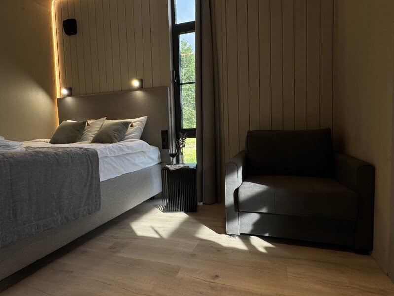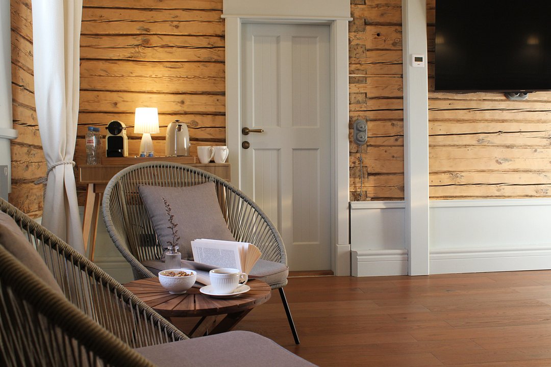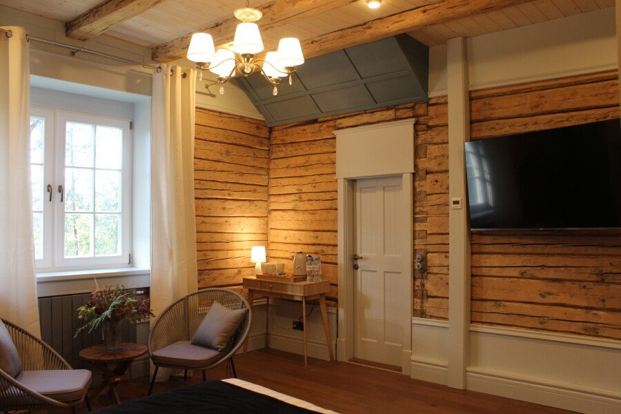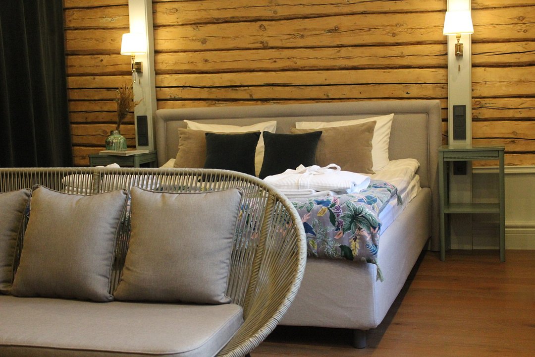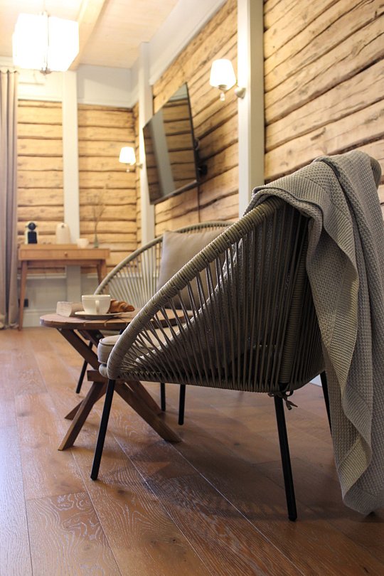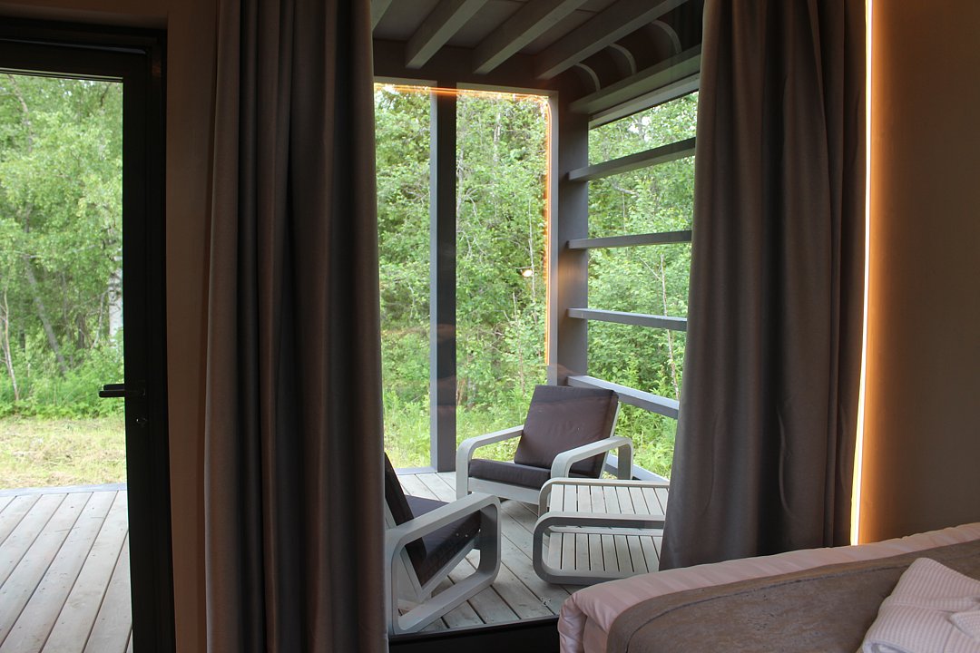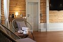 В номере также установлены два уютных кресла и столик. Интерьер комнаты выполнен из натуральных деревянных панелей с использованием элементов скандинавского декора. Из окон этого номера можно любоваться великолепными закатами.